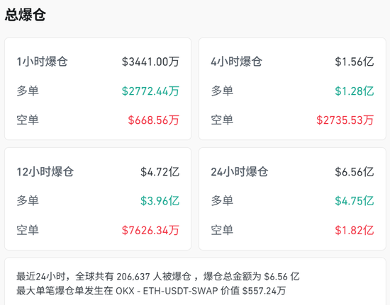 CoinGlass数据显示,最近24小时,全球共有20.66万人被爆仓,爆仓总金额为6.56亿美元,其中,多单爆仓4.75亿美元,空单爆仓1.82亿美元。