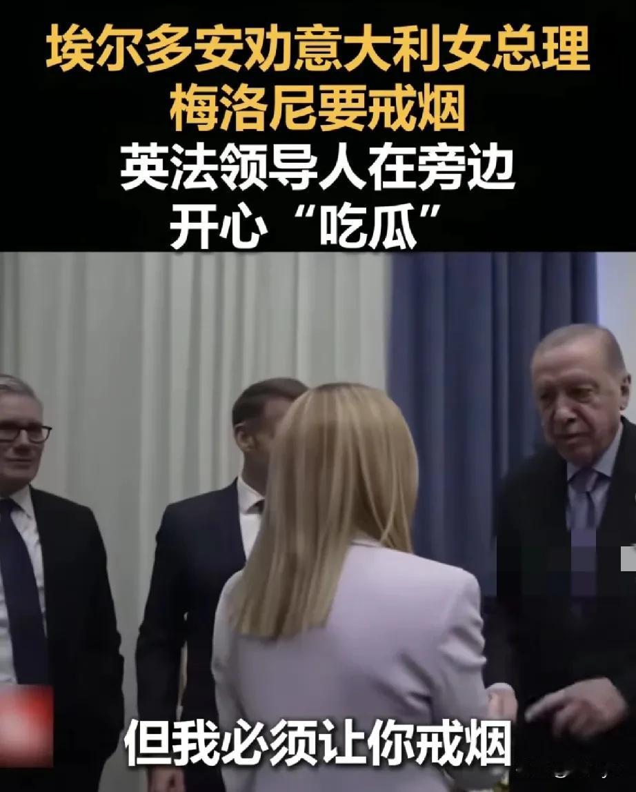 趣事:土耳其总统埃尔多安劝意大利女总理梅洛尼戒烟。10月13日,在埃及举行“和平峰会”期间,士耳其总统埃尔多安与意大利总理梅洛尼会晤时,发生一件趣事。埃尔多安与梅洛尼握手致意,称赞她的仪容仪表,梅洛尼表示感谢。埃尔多安表示,“我必须让你戒烟”,梅洛尼开玩笑回应道:“我知道,我知道,我不想杀人!”英国首相斯塔默和法国总统马克龙在一旁大笑! 梅洛尼:一切都好吧? 埃尔多安:你看起来很棒! 梅洛尼:谢谢! 埃尔多安:我必须让你戒烟! 梅洛尼:我知道,我知道,我不想杀人! (众大笑) 其实,国家领导人也是人,他(她)们也是多侧面的,既有严肃刻板的一面,也有风趣幽默的一面,而严肃以外的侧面,似乎更能体现领导人真正内心和精神世界,也更能彰显其人格魅力,也是他(她)们更可爱之处! 土耳其欧洲关系 埃尔多安动向 意大利领导人