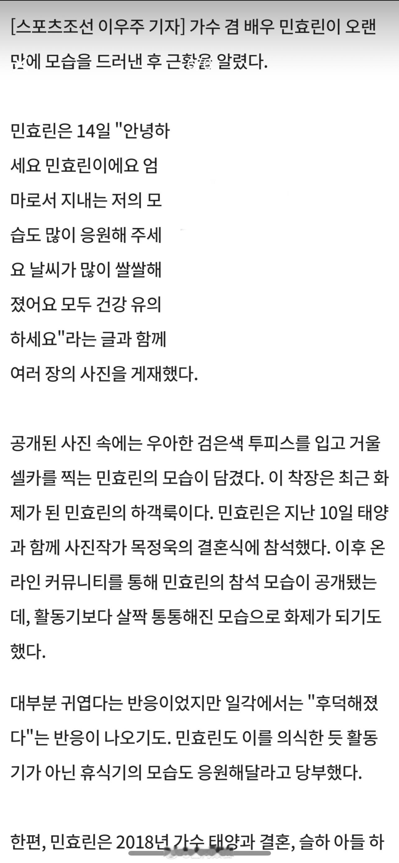 歌手兼演员闵孝琳在久未露面后透露了近况。
