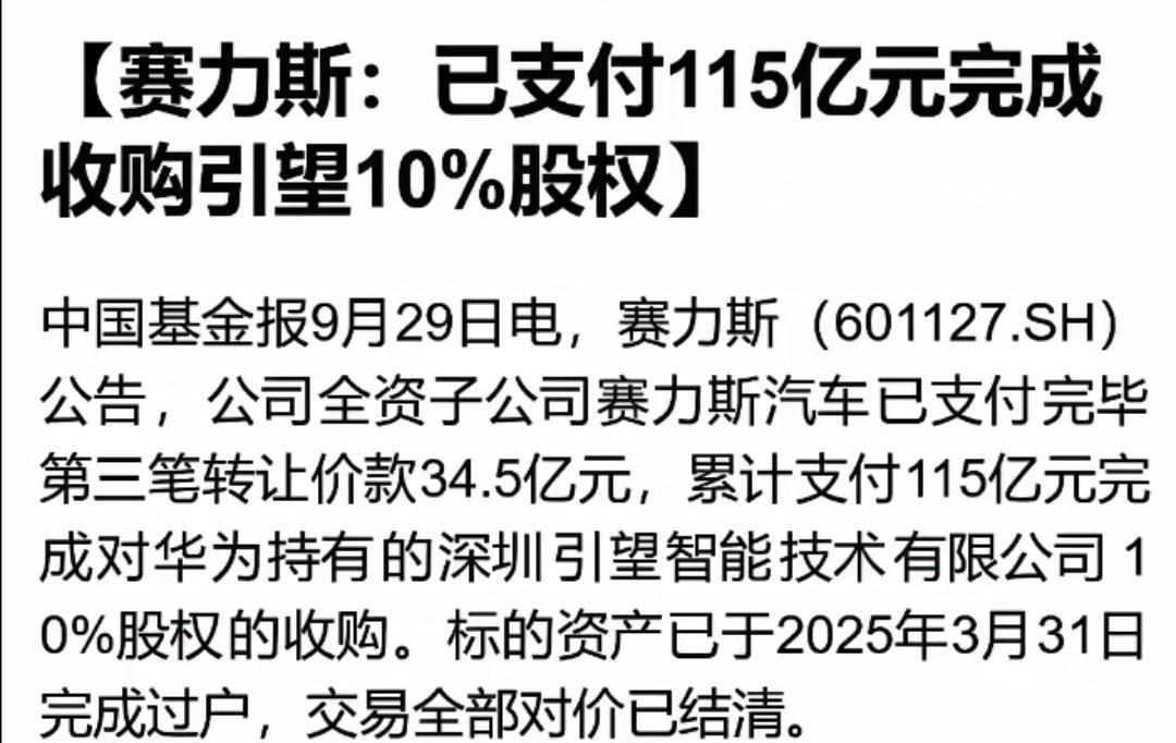 赛力斯:已支付115亿给华为。 阿维塔:已支付115亿给华为。 继赛力斯之后,阿维塔也宣布累计支付115亿给华为引望,这两家车企都分别拥有华为引望的10%股权。选择大于努力,赛力斯已经证明过这一点,在和华为合作之前,很多人压根没听说过赛力斯,赛力斯还在从事一些微型车的生产,自从跟了华为,完全变了样,直接成为销量最高的国产豪华汽车品牌,让比亚迪吉利奇瑞长安这些巨头都懵了,更是把其它新势力车企打的满地找牙,今年上半年赛力斯净利润为29.41亿,比曾经新势力车企老大哥理想还要高出10多亿。要我说现在的赛力斯还是被严重低估了,之前花20多亿从华为手中买断问界所有商标,又花接近400亿进行投资,现在又给华为支付115亿,赛力斯现在简直是富得流油啊。 加入引望后,赛力斯必然会迎来第二次起飞,因为现在引望的车企成员还很少,意味着华为研发的众多先进汽车技术,问界都能最先用上,这对于其它车企来说完全就是降维打击,毕竟现在单纯的授权ADS和一些底盘技术,都让问界在高端SUV市场一个能打的都没有,包括奔驰宝马奥迪,说白了加入引望相当于赛力斯第二次站在风口上,难怪赛力斯市值迅速突破2700亿,已经成为国内第二大市值车企,仅次于比亚迪,要知道以前赛力斯市值才一两百亿,现在正在奔向3000亿,小说爽文都不敢这么写啊。 作为长安的高端品牌,阿维塔没有打入鸿蒙智行确实比较可惜,现在支付115亿加入引望,看来阿维塔已经决定死心塌地跟华为了。与此同时阿维塔战略2.0发布,目标是2027年实现年销量40万台,营收突破1000亿,2030年目标销量是80万台,10年后目标销量150万台。我觉得阿维塔这个目标有点保守了,毕竟问界成立短短几年,年销量都冲50万台去了,按照当前增速,2026年销量突破80万台一点问题都没有。 引望是华为智能汽车业务的核心战略,就是要生态共建,说白了就是要改写传统汽车的游戏规则,华为注定要成为电动汽车供应商巨头,不仅是提供高阶辅助驾驶这么简单,还要提供底盘技术,电池管理技术,车机系统,汽车芯片等硬件。这么说吧,未来会有更多车企融入华为汽车生态圈,因为华为要技术有技术,要品牌有品牌,压根不愁销量,大家说是嘛。