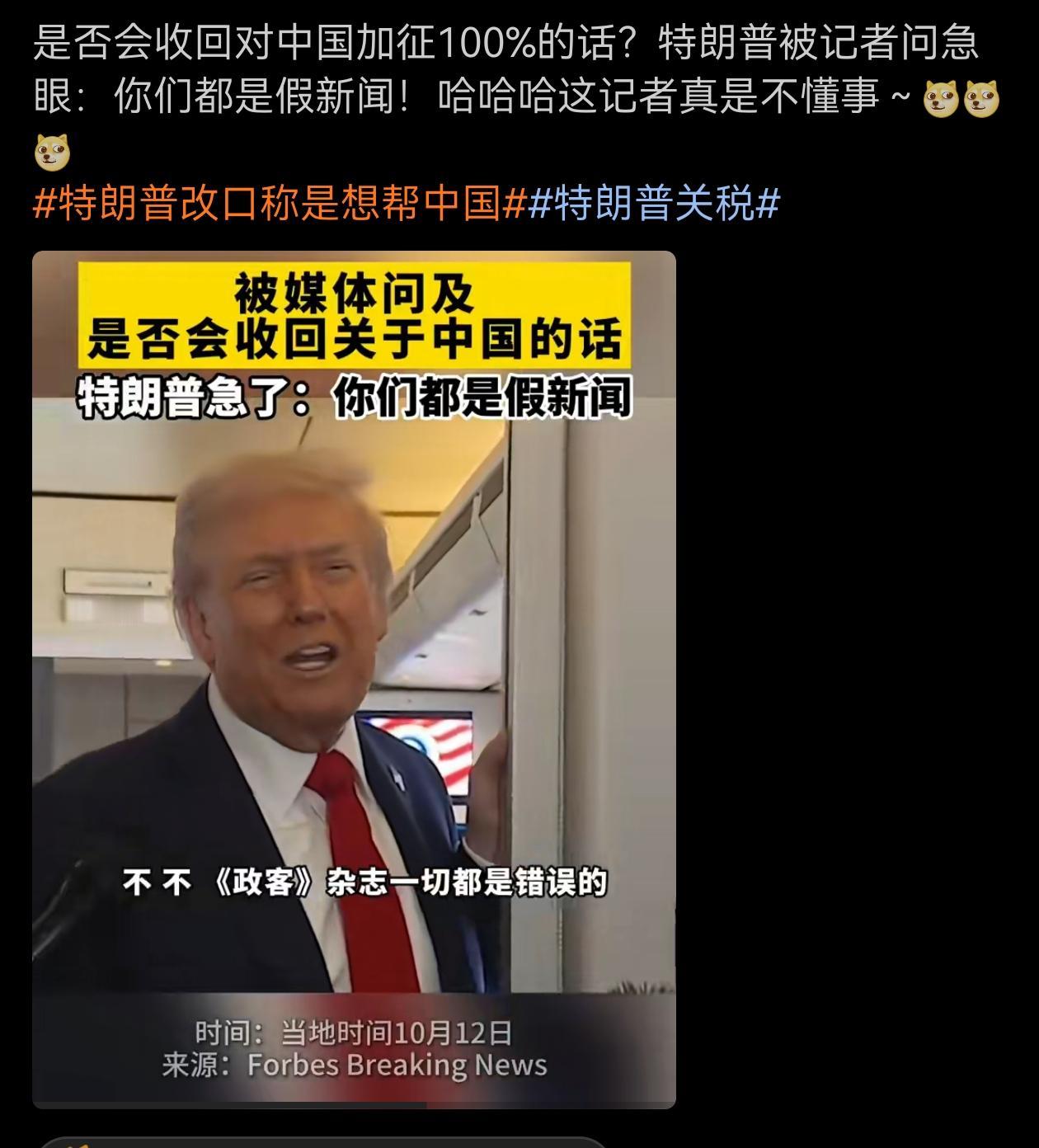 是否会收回对中国加征100%的话?特朗普被记者问急眼:你们都是假新闻!哈哈哈这记者真是不懂事!