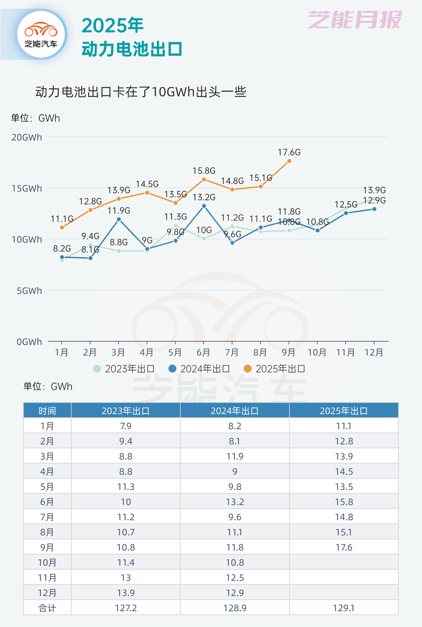 动力电池出口量为17.6GWh,占66.0%,环比增长17.1%,同比增长50.9%;