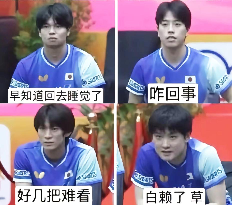 这个画面给得好, 这呆若木鸡的表情, 这镜头切得到位, 必须给加鸡腿。 梁靖崑赢下松岛辉空后, 镜头特意切到坐在场外的日乒队员。 他们看呆了、看愣了、看懵了, 这“煮熟的鸭子怎么飞了”, 不应该呀, 明明离胜利只差一步了。 就是让你们眼睁睁看着, 怎么从你们手里一分分夺回来。 就是让你们眼睁睁看着, 我们是怎么庆祝的。 你们不是挺能喊挺能叫的吗? 怎么瞬间“哑巴”了, 谁给你们按下了暂停键。 只能说天狂必有雨, 人狂必有祸, 你们兴奋过头了。 (图片源自于网络)