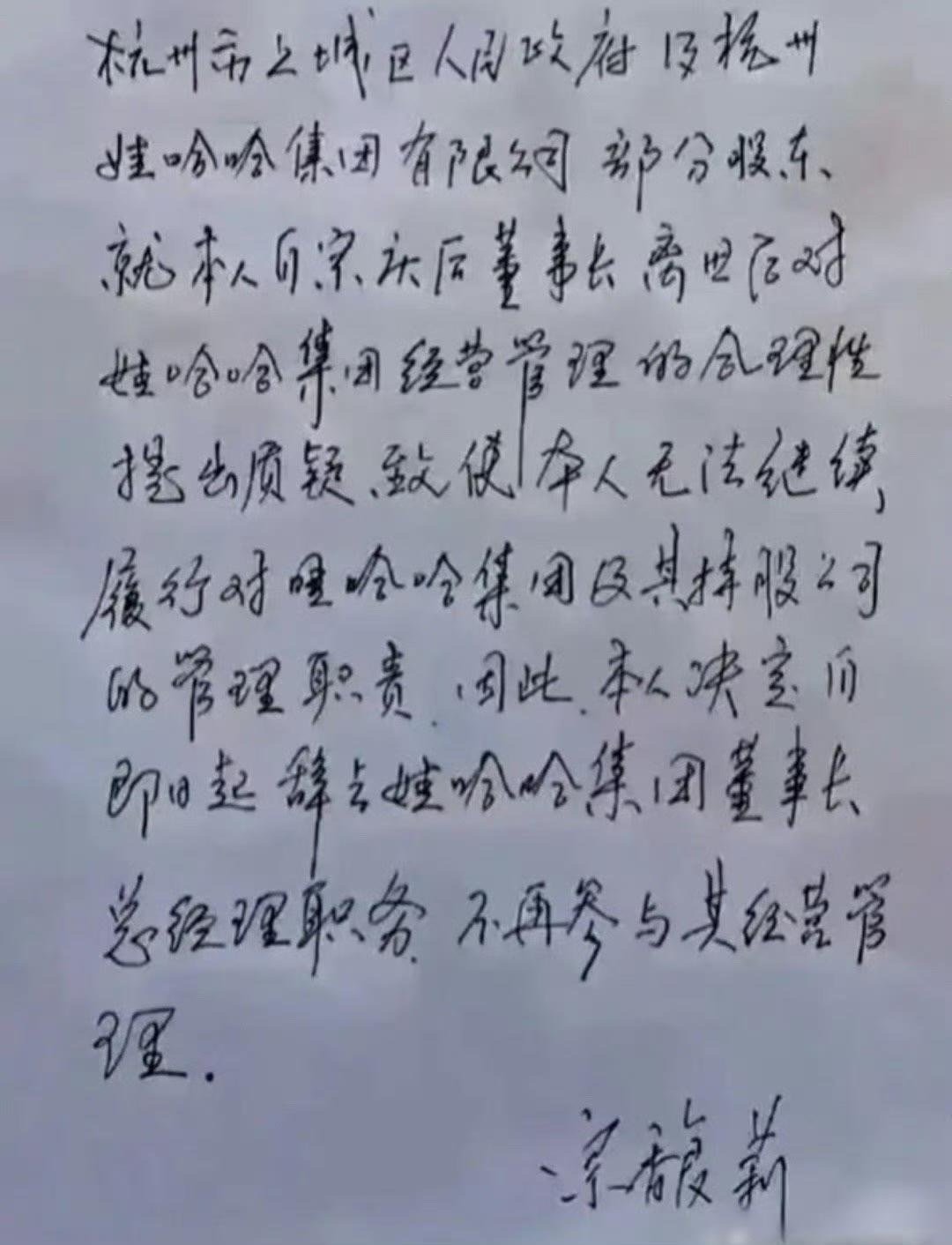 宗馥莉辞职了,她的手写辞职信,字如其人。