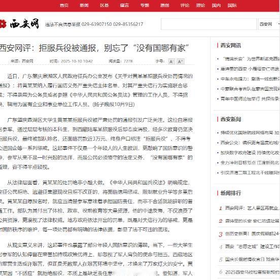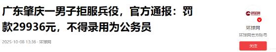 广东肇庆一名大学本科男生,主动报名参军,一路顺利通过体检,如愿进入西藏陆军服兵役。可谁也没想到,他到了部队后,却因难以适应训练想退伍。即便部队多次耐心教育引导,他仍铁了心拒绝服兵役,还放话愿承担一切法律后果。之后,他被部队除名并退回原籍,被罚款29936元和6条处罚通知! 事情要从2025年上半年说起,家住鼎湖区永安镇的黄某某,当时还是名在校大学生,由于他从小就心怀梦想、报效国家,在收到征兵办的宣传短信后,他二话不说就去主动报了名,要求去当兵。 当兵可不是件容易事,得闯过体格检查、政治考核、役前教育三道关,可黄某某一路顺风顺水,各项检查和考核都顺利通过。 到了3月份,所有手续办齐,他被正式批准入伍,分配到了西藏陆军某旅服役。要知道西藏是高原地区,部队的训练强度和管理要求本来就比平原地区更严格,这为后来的事情埋下了伏笔。 刚到西藏的军营,黄某某很快就发现现实和想象的不一样。高原上的空气比平原稀薄,每天雷打不动的晨练才开始没多久,他就气喘吁吁;部队里要求被子叠成方方正正的“豆腐块”,衣物摆放得一丝不乱,这些细致的规定让他觉得束缚;加上高强度的军事训练和说一不二的纪律要求,从小没吃过太多苦的黄某某渐渐扛不住了。 没过多久,黄某某的服役态度就变得消极起来。训练时他总是敷衍了事,集体活动也躲躲闪闪,原本报名时的热情彻底没了踪影。 部队领导很快发现了他的异常,第一时间就找他谈心,苦口婆心地讲部队纪律和军人的责任。可黄某某只是听着,根本没往心里去。 为了帮他回心转意,部队专门联系了鼎湖区征兵办,工作人员专程赶到西藏,拿着《兵役法》一条一条给他讲拒服兵役的后果。与此同时,老家永安镇的基层武装部干部也一遍遍打电话、发信息劝说,甚至他的亲属也赶到部队,拉着他讲家里的期盼,劝他再坚持坚持。 可不管大家怎么说,黄某某都像铁了心一样,态度十分坚决,反复说自己就是适应不了,必须离队,还放话说愿意承担一切法律后果。 那时的他,他大概以为最多就是被送回家,没把这些警告当回事。可殊不知,部队可不是想来就来、想走就走的地方…… 5月份左右,因为黄某某无正当理由坚持要求提前退出现役,经多次教育仍不改正,他所在的部队依据《中国人民解放军纪律条令(试行)》的规定,正式给予他除名处分,把他退回了肇庆原籍。 本以为被送回家就没事了,没想到更重的处罚还在后面。10月8日,鼎湖区人民政府征兵办公室发布了正式通报,把对黄某某的6项处罚公之于众,每一条都直接影响他的生活。 第一条就是信用惩戒,把黄某某纳入履行国防义务严重失信主体名单,他的失信信息会记入个人信用记录,在公共信用平台公开共享。这意味着以后他贷款买房买车、甚至坐高铁坐飞机都可能受影响。 第二条是真金白银的罚款,不仅撤销了他和家人本该享受的义务兵优待,还要按鼎湖区2025年义务兵家庭优待金14968元的2倍,罚他29936元。这钱要是不交,政府会直接找法院强制执行。 第三条断了他的就业路,以后公务员、参公管理的岗位他都不能考,国有企业和事业单位也不准录用他;第四条更是留了终身污点,在常住人口信息系统和他的户口本“服兵役栏”里,会永久写上“拒服兵役”四个字,而且两年内不能办出国(境)手续。 第五条堵了他的升学路,两年内不准办升(复)学手续,就算想考研、留学也得等两年;第六条则是公开通报,通过新闻媒体把他的事在全区传开,成了反面典型。 看着一张张处罚条例,黄某某瞬间懵了,现在他不仅要凑齐近三万元的罚款,还要带着“拒服兵役”的烙印生活,就业、升学、出行都受影响。他当初说“愿意承担后果”,如今真的应验了,可这代价实在太大了! 消息传到网上后,瞬间引起网友热议,有人对他的行为表示理解,毕竟命是他自己的,他觉得受不了,没人能强迫;当然也有一部分人对这个处罚规定表示赞同,都说军人以“服从命令为天职”,像他这种想一出是一出的人,就必须受到应有的惩罚! 对于这件事,你有什么看法呢?欢迎在评论区留言讨论!