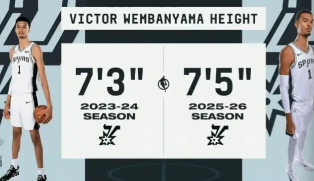 此前,文班亚马在2023年NBA选秀时被列为7尺3寸(约2.21米),但根据圣安东尼奥马刺队的最新官方数据,他的身高已更新为7尺5寸(约2.26米)。