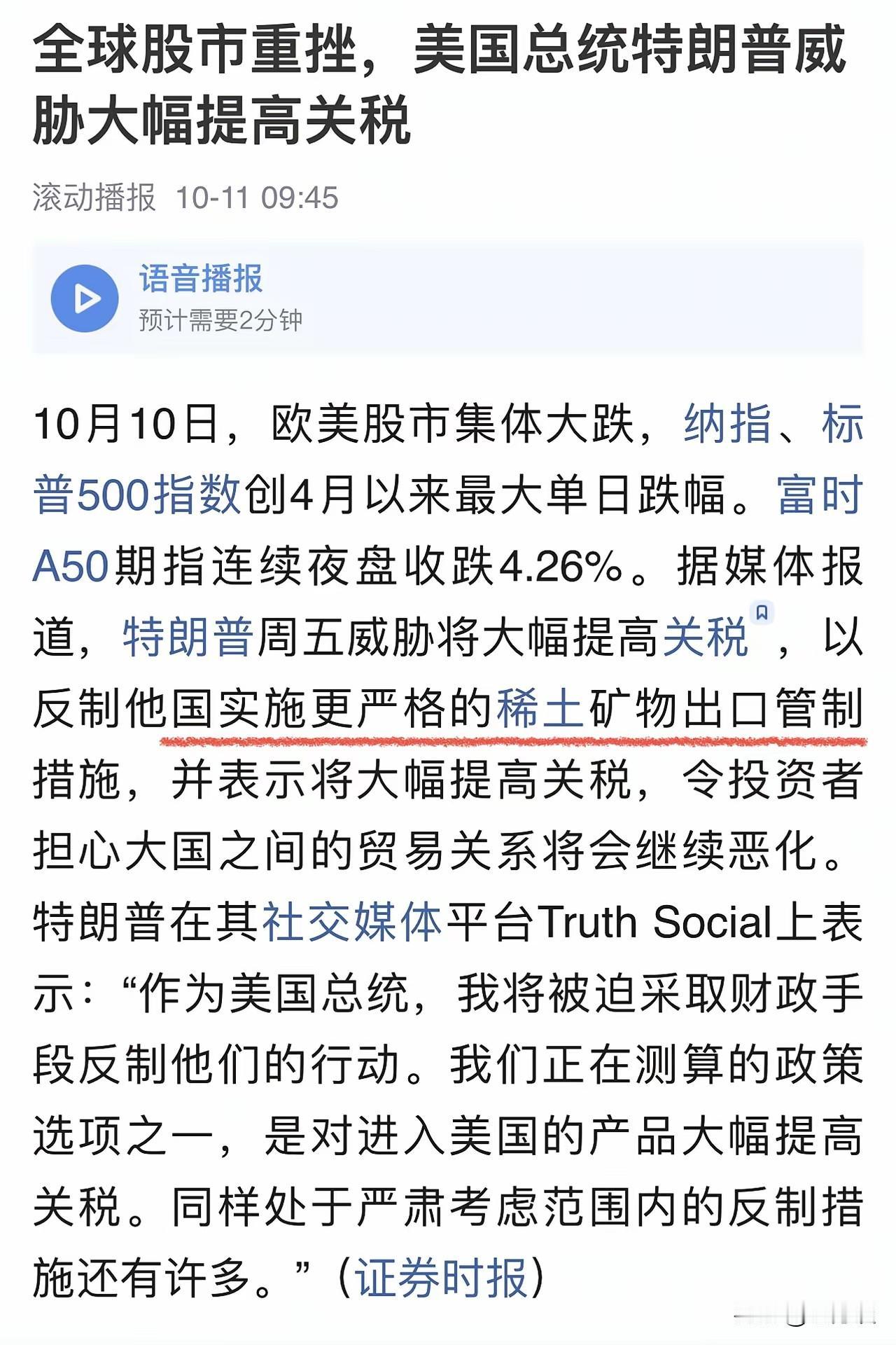 想不到特朗普直接掀翻桌子,不跟大家玩了,白瞎了好多次跟他们进行的上心上肺谈判。特朗普宣布,自2025年11月1日开始,对中国加征百分之百的关税以示我们对稀土矿物出口限制的报复。 面对美国的两面三刀,我们对于卡美国脖子的矿物质稀土采取了限制出口的措施,我们这一举措让美国特别的恼火,所以特朗普不惜撕毁双方已经达成的协议,提出对中国商品再次加征关税,对中国出口商品的关税再次提高了百分之百!特朗普就像一个小孩子一般,说翻脸就翻脸,根本就不让你思索,就好比天气预报一般,说变脸立马就变脸。 面对美国如此的不讲信用的行为,我们必须时刻予以提防,所以只要我们采取好预防措施,美国的三两面三刀都是不可怕的!我们打是为了谈,只要把他们打疼了,自然而然就会回到谈判桌上。