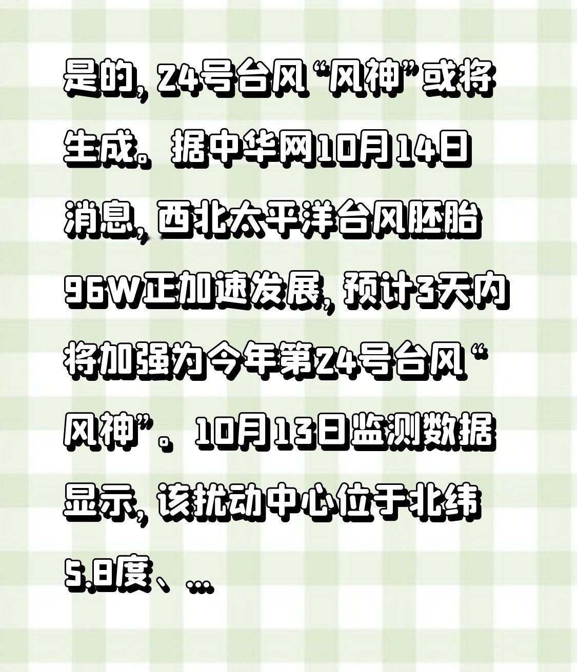 是的,24号台风“风神”或将生成。据中华网10月14日消息,西北太平洋台风胚胎9