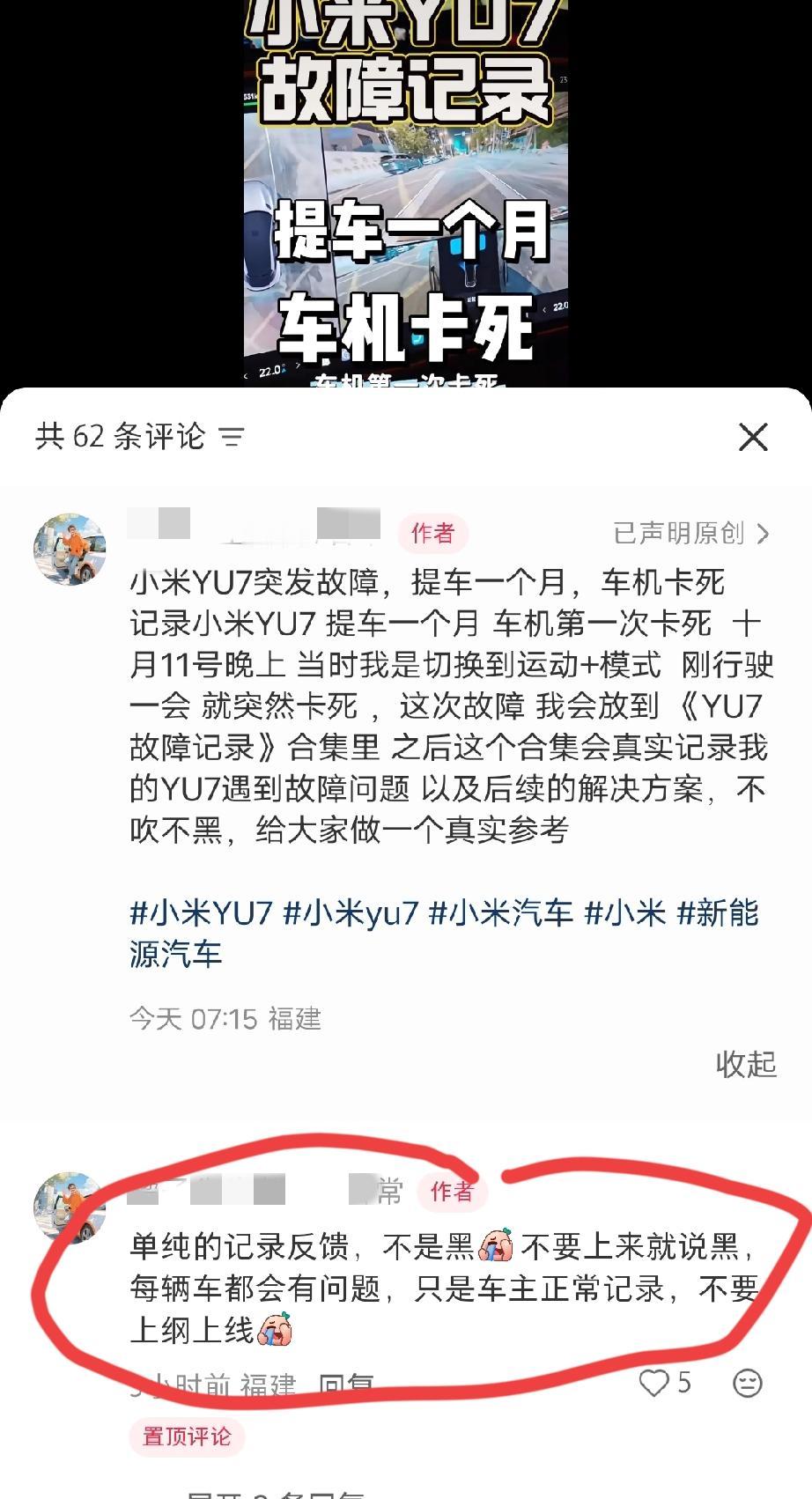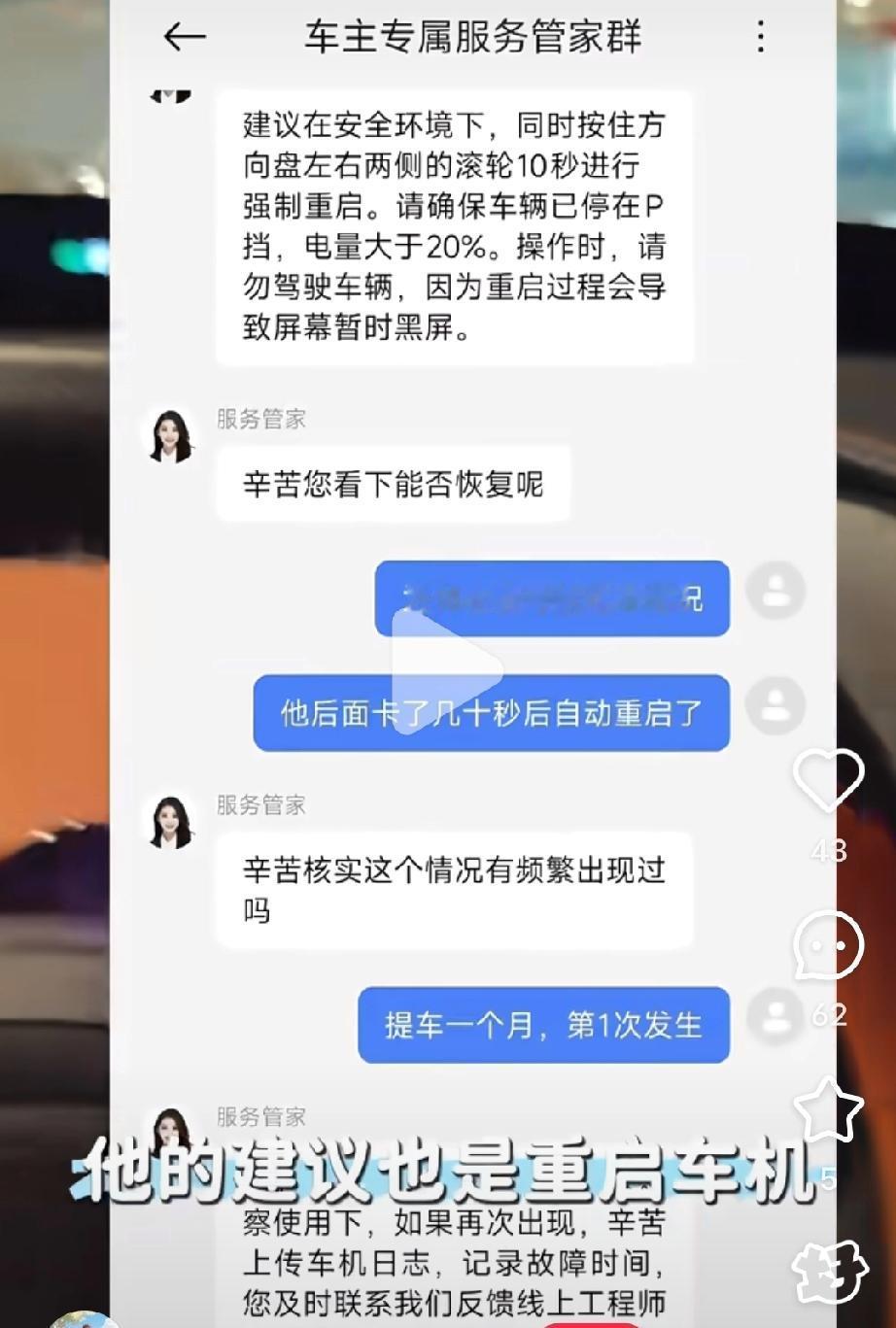 福建御妻车主发文称:提车一个月,突遇中控屏和天际屏全部卡死,但正常行驶挂挡都没有问题。大概过了一分半钟,车机自动重启。后续反馈给客服,他的建议也是重启车机…… 这位车主表示:他就是单纯的记录反馈,不是黑,每辆车都会有问题,请大家不要上纲上线…… 有网友表示:就是不知道如果这些车主在高速上遇到车机卡死的情况,他们会如何处理?如果车主是在辅助驾驶,车机卡死又会出现何种情况? 网友不禁吐槽:果然,真正的米粉都会自适应的!可车主把这样的视频发布到网上,实际上已经被开除出米粉的队伍了。[我想静静][我想静静][我想静静] 各位网友,对电车车机卡死这个事情,大家是什么看法?