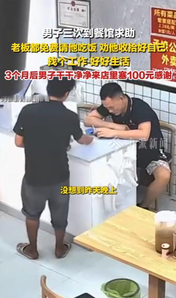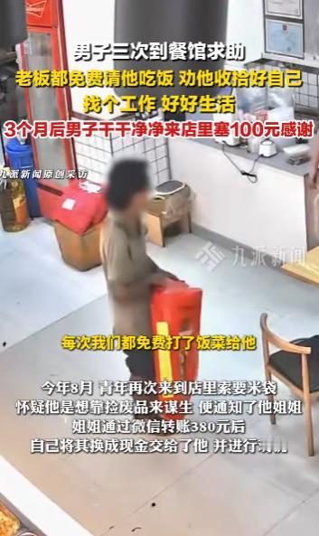 “太有人情味了!”10月14日,广东广州,一男子曾三次到餐馆求助,餐馆老板每次都免费请他吃饭,劝他找个工作好好生活,结果3个月后男子干干净净出现在餐馆,塞给老板100元钱感谢,网友:小伙子相信世界有光,老板相信善良的力量! 人总有遇到困难的时候,你随手释放的善意,很有可能成为一座“灯塔”,帮助身陷困境的人找到前进的方向。 一名衣着脏乱、蓬头垢面的年轻男子走进了餐馆,表示自己很饿但却没钱吃饭,餐馆老板觉得他应该是遇到什么难处了,二话没说从后厨端来了一份饭菜免费请男子吃。 不久后男子再次来到店里,餐馆老板又请他吃饭,这次老板询问了男子的情况,得知男子还有个姐姐,便帮忙联系到了他姐姐,男子姐姐十分明事理,立马将饭钱转给了老板。 没过几天,男子来到餐馆索要米袋、纸壳,餐馆老板怀疑他是想卖废品挣钱,立马告知了男子的姐姐,男子姐姐立马通过聊天软件转来了380元。 餐馆老板将这些钱换成现金交给了男子,并语重心长劝导他,大小伙子有手有脚的,收拾收拾自己找份工作好好生活,没什么坎是过不去的。 也许是听进去了老板的话,三个月后,男子骑着自行车来到餐馆,穿戴整齐收拾得干干净净,给餐馆老板塞了100块钱作为感谢,老板追出去还,男子却早已跑远。 一个善良的人遇到了一个知恩图报的人,不少网友被老板和男子的故事“暖”到了,正是善良,才让我们的世界变得更美好! 信息来源:《被帮助男子3月后塞钱感谢店主 ,店主:曾劝他收拾好自己,好好找个工作,好好生活。》九派新闻