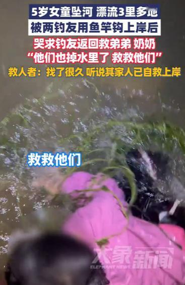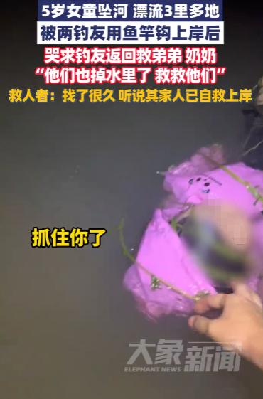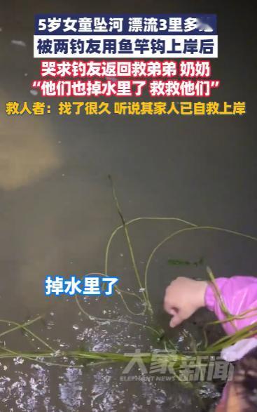 “福大命大!”10月13日,河南邓州,一5岁的女童坠河漂流了3里地,幸好被两名深夜在河边钓鱼的钓友发现,用鱼竿将女孩钩上岸,才得知女孩的奶奶和弟弟竟也掉进了水了!网友:钓鱼竿这下变成“救命杆”了! 曾有人调侃钓鱼佬无处不在,这句话一点也没错,而且他们几乎都很热情,乐于助人,不管是问路还是寻人,找附近野钓的钓友们准没错。 这天,两名钓友深夜在河边野钓,隐约间听到一个稚嫩的童声边哭边喊“救命”,两人赶忙打起手电四处寻找,这才发现不远处的水面上漂着一个5岁的女孩。 钓友们利用手中的鱼竿,巧妙地将女孩钩到了岸边,期间女孩的情绪激动,一直在哭,说话上气不接下气,两名钓友不断柔声安抚女孩。 靠近岸边后,女孩请求两人救救自己的弟弟和奶奶,他们两人也都落水,两名钓友二话不说,直接下水沿着女孩漂来的方向寻找。 两人找了很久都没发现人影,无奈之下只能上岸,后来听说女孩的家人们都已经自救上岸,这才送了一口气。 不少网友为这两名钓友点赞,直呼钓鱼竿这下变成“救命杆”了,幸好这名小女孩福大命大遇到了这两位热心的叔叔! 信息来源:《5岁女童坠河漂流3里多地,被两钓友用鱼竿钩上岸后,哭求钓友返回救弟弟、奶奶,“他们也掉水里了,救救他们”》大象新闻