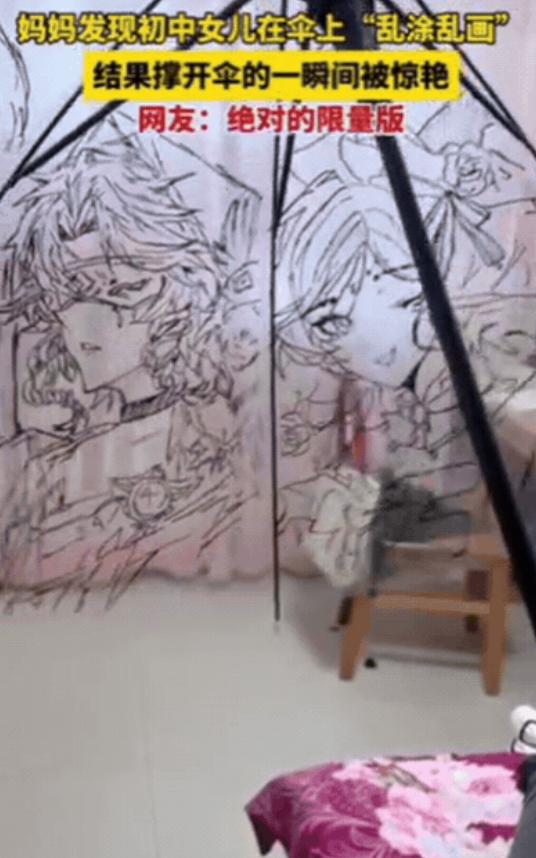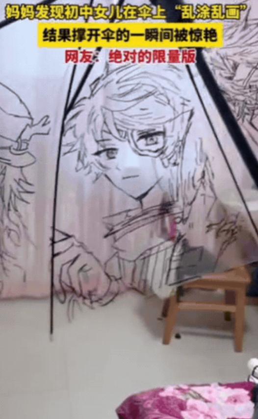 内蒙古,妈妈发现初中女儿,竟然在伞上“鬼画符”,刚准备呵斥,结果当她撑开伞后,瞬间被女儿的画惊艳到了,上面的是动漫人物,一个个都栩栩如生,非常的好看,网友:绝对的限量版。 10月13号那天,内蒙古赤峰的一位妈妈正收拾阳台,眼角扫到墙角立着的那把旧伞,一下子就皱起了眉。 原本透明的伞面上黑乎乎一大片,线条缠在一起乱得很,看着就像谁随手瞎涂的“鬼画符”。 这是上初中的女儿的伞,妈妈心里顿时冒起火气,好好的东西总瞎折腾,这不是糟蹋吗? 她走过去拎起伞,本来想着等女儿回来,非得好好说她几句。 可刚走到玄关,心里忽然动了一下,这孩子平时挺乖巧的,没事就爱趴在桌上涂涂画画,课本上、草稿纸上,总少不了她画的小人儿,也没见她糟蹋过什么东西,这次会不会有别的情况? 这么一想,妈妈的脚步停住了,手不自觉地一扬,“哗啦”一声,伞面就撑开了。 这一下,她原本到了嘴边的话全堵在了喉咙里,举着伞愣在原地,刚才的火气也跟着消了大半。 哪是什么乱涂啊?白色的伞面铺开,像块被展开的画布,每一个扇面上都画着动漫人物。 左边是扎着蝴蝶结的少女,一双眼睛画得俏皮可爱,右边的几名少年摆着不同的姿势,头发和衣服的纹理都十分清晰,不知道的,还以为是专业的画师画的。 再凑近看,伞柄那儿还藏着女儿名字的缩写,妈妈这才想起,最近女儿总躲在房间里,晚自习回来就趴在桌上写写画画,问她就说“做作业”,原来一直在琢磨这个。 之前还以为孩子是“不务正业”,现在看来,全是孩子偷偷攒的心思。 她把伞举到窗边,阳光透过来,动漫人物的眼睛也跟着亮起来,活灵活现的,看着就跟从电视里走出来似的。 这哪还是把旧伞,分明是孩子藏在日常里的小世界,后来她想着这么好看的画,就拍了段视频发在了网上。 没几天,视频下面就堆了好多评论,有网友说这孩子也太有天赋了,这伞独一无二的,要是自己家孩子画的,指定得好好收藏一辈子。 更多人在说,羡慕这位妈妈没直接发火,还愿意打开伞看看,要是换了自己,说不定第一眼看到乱涂就先批评孩子了。 生活里不少家长都这样,看到孩子摆弄东西“不合规矩”,第一反应就是着急阻止,却忘了多等一秒、多看一看。 就像这把伞,没撑开的时候看着是糟蹋东西,撑开了才知道里面藏着孩子的创造力。 话说回来,妈妈也没多想别的,就是觉得孩子的心思难得。 女儿后来还跟她说,选这把旧伞是怕画坏了心疼,每一笔都琢磨了很久。 这伞之所以让人羡慕,不只是画得好看,更因为妈妈愿意多走那一步,没被第一眼的“乱”困住,给了孩子一个被看见的机会。