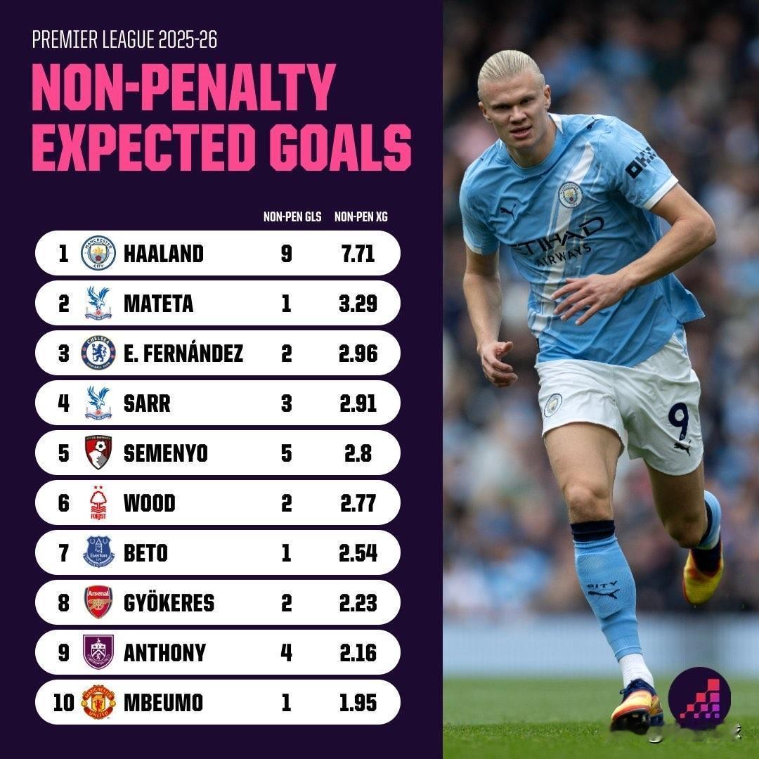 📊 哈兰德本赛季领跑英超联赛非点球预期进球榜: 1️⃣ 哈兰德 – 9粒进球 | 7.71 xG 2️⃣ 马特塔 – 1球 | 3.29 xG 3️⃣ 恩佐·费尔南德斯 – 2球 | 2.96 xG 4️⃣ 萨尔 – 3球 | 2.91 xG 5️⃣ 塞梅诺 – 5球 | 2.80 xG … 哈兰德的进球能力完全处于另一个层级。真正的进球机器!