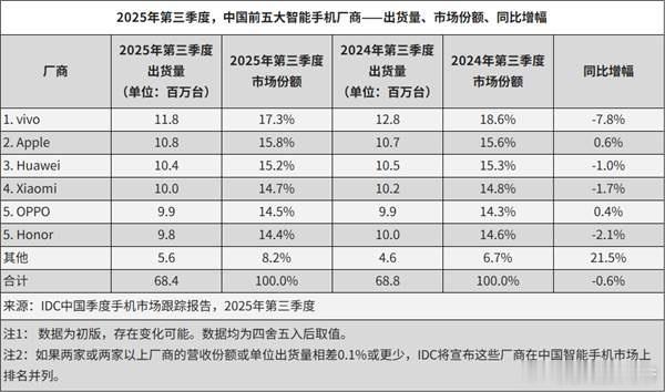 2025年Q3中国前五大智能手机厂商出炉:华为第三、小米第四
