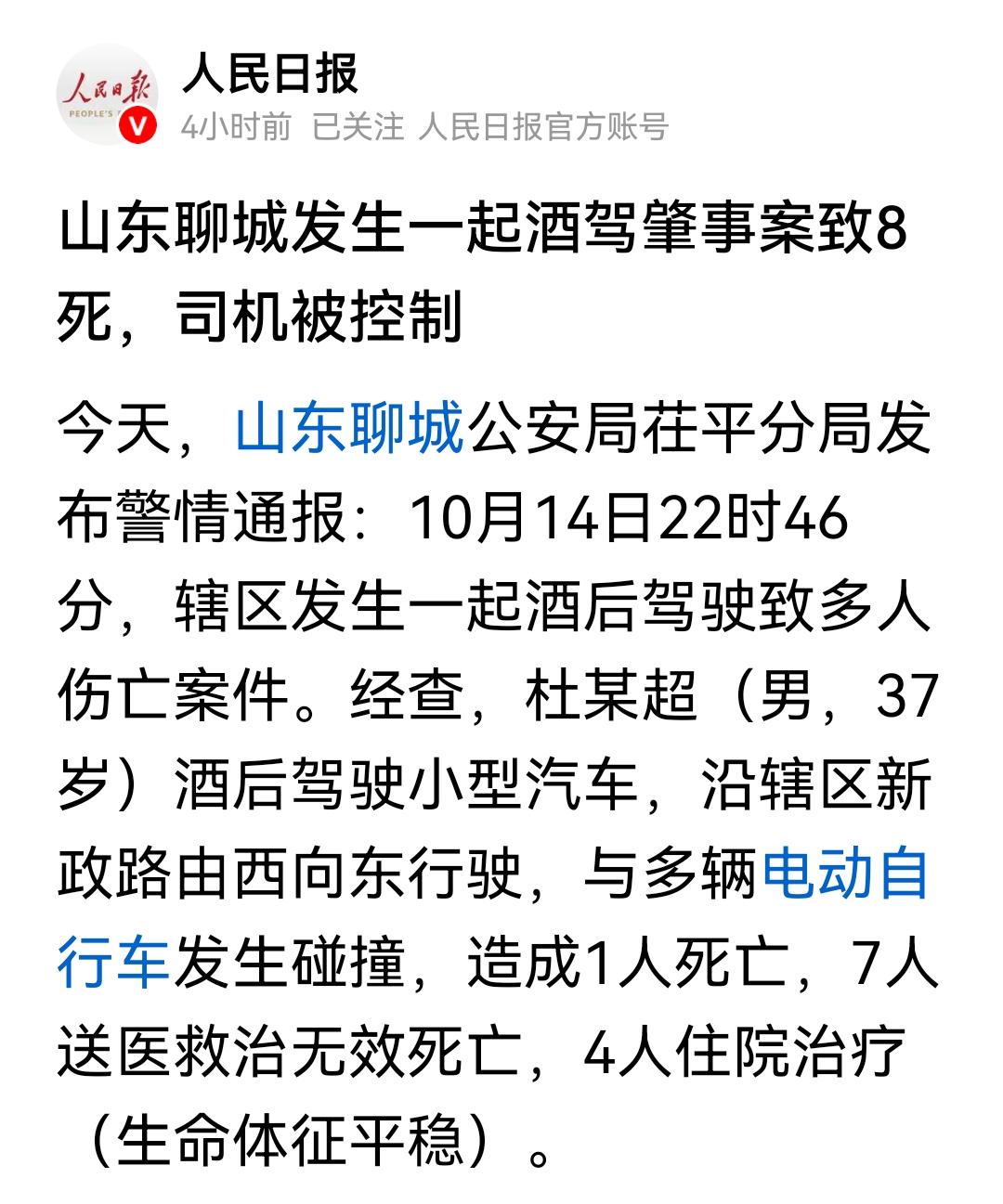 8死4伤!多少个家庭因此破碎!血的教训为何总被遗忘? 严查之下,为何仍有人酒后驾车、视人命如草芥? 这绝非普通违法,而是对公共安全的公然践踏! 罚款扣分太过苍白,必须重判重罚、零容忍! 对这种危害社会的恶行,死刑亦应在考量之列。 不能再沉默。必须法律亮剑、社会共治,让酒驾成为无人敢碰的高压线!