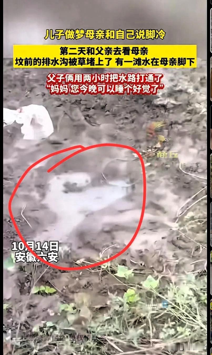 家人们谁懂啊! 安徽六安这事儿看的我心酸了,儿子梦见妈妈说脚冷,第二天拉着爸爸去坟前一看,果然排水沟被草堵了,妈妈坟前积了一滩水! 好多人说这是巧合,可我觉得这是刻在血脉里的牵挂。 要是没把妈妈的冷暖放在心上,谁会把一个梦当真?父子俩没多说一句话,埋头清理了俩小时,直到水路通了才停下,还对着坟头轻声说“妈您能睡好觉了”。 这份孝心哪是做给别人看的?是哪怕阴阳两隔,也想把妈妈的“委屈”都抚平。 比起那些嘴上喊着孝顺、却连父母生日都记不住的人,这对父子用最实在的行动,把“爱”写得明明白白。