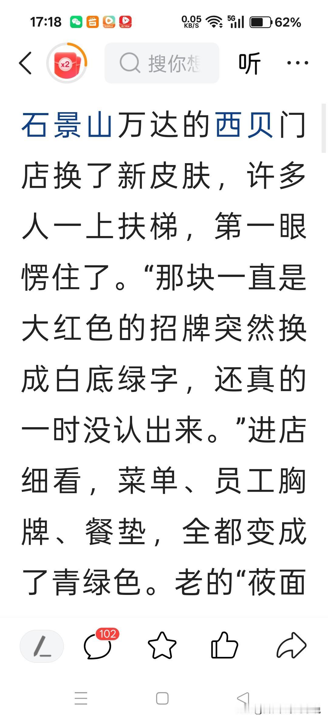 西贝换的不过是门面装潢,何来换形象一说。 究竟什么是形象,是西贝不清楚,还是说这话的人不明白,换个门头颜色就能算换形象了? 要是我没猜错,西贝是否采用预制菜,才关乎它的形象,这与门头颜色有何关联?西贝若想真正改变形象,难道不该多推出现炒现卖的食品吗? 这才是对西贝换形象的正确理解,和门头颜色毫无关系。