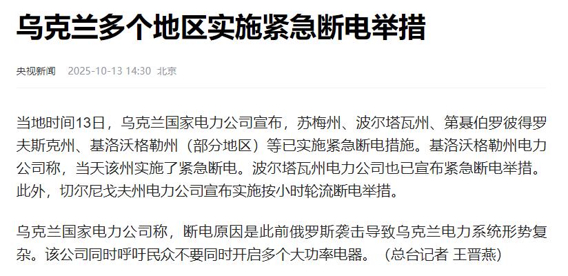 乌克兰陷入“用电危机”,同时也不想让俄罗斯好过! 当地时间10月13日,乌克兰国家电力公司刚宣布对多个地区紧急断电,这事儿的直接原因就是之前俄罗斯的袭击把电力系统打坏了。 泽连斯基也坦言,他们早料到会有电力问题,甚至说再挨一两次打击就得从国外买电。 乌克兰其实也不是没准备,周边的波兰、罗马尼亚这些邻国都能帮忙供电,比如今年5月就从罗波斯三国紧急进口了两万多兆瓦时电力,4月也从五个欧洲国家调了九千多兆瓦时。 但输电线路的容量就那么大,各国电网协调起来也麻烦,这些进口电只能解燃眉之急,没法全面缓解老百姓和企业的用电压力。 更要命的是,国际能源署的数据显示,乌克兰近80%的火电厂和三分之二的水电站都被打坏了,现在电力缺口已经达到高峰需求的三分之一,相当于很多城市得轮流停电才能撑住。 自己这边没电用,乌克兰也想着反击,最近老袭击俄罗斯的能源设施,想让对方也尝尝断电的滋味。但这招效果实在有限,俄罗斯毕竟是能源出口大国,电网建得早、覆盖广,备用电源也足,修复技术也成熟。 就拿扎波罗热核电站来说,虽然9月底被打坏了外电线路,只能靠柴油发电机供电,但人家储备的柴油够撑很久,核设施也一直可控,没出大问题。 反观乌克兰,10月10号刚被无人机和导弹炸了基辅的能源设施,立马就有地方停电。俄罗斯的关键能源设施保护得也严,加上他们在战线控制上占优势,能源运输线路守得牢,乌克兰的袭击顶多造成小麻烦,根本没法让俄罗斯大规模停电。 现在乌克兰没什么远程打击手段,想让俄罗斯陷入和自己一样的电力危机,基本是不可能的。除非美国真的给他“战斧”导弹,但考虑到俄罗斯的强硬态度和可能造成的冲突激化,目前美国更多是表态施压,暂时还没有决心真送。 眼下的情况是,乌克兰修电力设施不仅要花时间,还得靠外部支援,世界银行估计重建成本得5240亿美元,光能源资产就需要680亿;而俄罗斯靠自己的能源和电网硬实力,短期内供电还能稳住。 这场能源博弈就像两个人掰手腕,乌克兰现在力气不够,只能靠着邻居帮衬,而俄罗斯底气足,天平明显往俄罗斯那边偏。