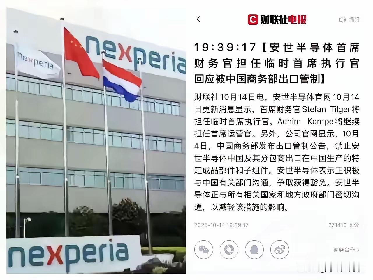 中国终于开始反击了。 荷兰刚刚冻结安世30家子公司资产、把股权托管给了第三方,咱国就出口管制,断了它中国产线的出货路,安世立马急着求豁免。 这一手回击,打得准、打得狠。别人卡我们脖子,我们就直接按住对方的命门。安世半导体在全球产业链中占据重要位置,它的中国产线一旦断供,荷兰那边立马坐不住了。这不是巧合,而是中国在关键技术领域积累的实力体现。 回想过去几年,西方动不动就搞技术封锁、资产冻结,以为这样就能让中国企业低头。可现实呢?咱们的产业链越来越完整,自主可控的能力稳步提升。去年中国半导体设备自给率已经突破30%,国产替代的步伐越走越快。 看看数据就知道,中国在全球半导体设备市场的份额从五年前的不足5%,增长到如今的12%。这不是凭空来的,是实打实的投入和技术突破。别人越封锁,我们越要自力更生,这条路走得艰难,却走得坚定。 安世急着求豁免,恰恰暴露了它的软肋。它的中国产线一旦断供,全球供应链都会受到冲击。这不是我们霸道,而是市场规律的直接体现。你有你的手段,我有我的底牌,谁也别想轻易拿捏谁。 荷兰这一招冻结资产,表面看是占了上风,实际却逼着中国企业加快自主替代的步伐。历史一次次证明,封锁从来压不垮中国产业,反而激发我们更强的创新动力。华为如此,中兴如此,如今的安世也不例外。 这场博弈背后,是科技主导权的争夺。中国不再是被动接招,而是主动出牌。出口管制这一手,既保护了国内产业链,也向世界传递明确信号:中国市场可以开放共赢,但绝不接受单边霸凌。 有人总爱说“中国依赖全球供应链”,却忽略了中国制造本身就是全球链的核心。安世事件再次提醒所有人,合作必须是双向的,尊重必须是相互的。任何试图切断中国与技术全球联系的行为,最终只会反噬自身。 眼下这场交锋才刚刚开始。中国的反击不是一时冲动,而是经过深思熟虑的战略选择。我们有市场、有技术、有决心,这三样加起来,就是最硬的底气。 各位读者你们怎么看?欢迎在评论区讨论。 安世半导体公司 安世科技