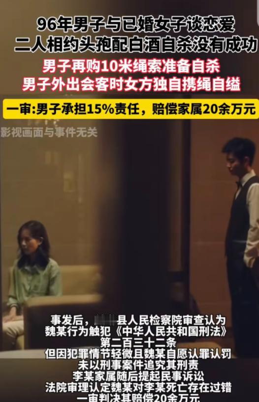 2023年陕西麟游,一29岁男子,在水产店打工时,不可救药的和一有夫之妇相爱,2人爱到发了狂,决定不能光明正大在一起,那就一同赴死,他们约好出去旅游时自杀,可没成功。 男子又买了绳子,两人准备上吊,不料,男子出去见朋友时,女子竟用绳子自缢身亡先走了一步,警方认为男子犯罪情节轻微,对他做出不起诉决定,女子家属不干了,直接把男子告上法庭,索赔80万,法院判决出乎意料。 2024 年春,陕西麟游县法院的民事审判庭内,李某丈夫张某猛地将录音笔拍在桌上:“法官您听!他亲口说‘一起走’,这就是诱导我老婆自杀的证据!” 录音里传来魏某模糊的声音,可法官反复播放后却发现异常 —— 每当提到 “离婚”“求助” 等字眼时,录音就出现明显卡顿。技术鉴定结果显示,这段录音被剪辑掉了关键部分:魏某紧接着说的 “咱先找律师,别做傻事”,被刻意删除。 坐在被告席的魏某突然红了眼,他从口袋里掏出一张皱巴巴的纸条 —— 那是李某自杀前写的未寄信件,上面 “我丈夫又打我了,魏某让我报警,可我怕他报复孩子” 的字迹,揭开了这场悲剧背后更复杂的真相。 时间倒回 2022 年夏,麟游县水产店的后门,魏某正帮李某处理手臂上的淤青。“他又动手了?” 魏某的声音带着愤怒,手里的碘伏棉签轻轻擦过伤口。 李某点点头,眼泪掉在水产箱的冰块上:“我提离婚,他就拿孩子威胁我。”那天之后,魏某开始偷偷帮李某收集证据 —— 他拍下李某身上的伤痕,记录张某家暴的时间,甚至联系了县城的律师,帮她咨询离婚流程。 有次张某来水产店找李某麻烦,魏某挡在前面:“你再动手,我就报警!”张某恶狠狠地瞪着他:“我们夫妻的事,轮得到你管?” 那时的魏某,从未想过要和李某 “一起赴死”,他满脑子都是帮这个受困的女人逃出苦海。 2023 年秋,李某的出租屋里,律师的电话让两人陷入绝望。 “张某把财产都转移了,还说要争孩子抚养权,以你现在的证据,官司不好打。” 电话那头的声音,像一盆冷水浇在两人头上。李某坐在床边,看着孩子的照片哭了一夜:“我要是走了,孩子怎么办?可我实在受不了了。” 魏某握着她的手,心里又疼又急:“咱再等等,我再帮你找新证据,总有办法的。” 可李某的精神状态越来越差,张某的骚扰也变本加厉 —— 他在李某家门口喷油漆,在村里散布谣言,说李某 “不守妇道”。 有天夜里,李某突然抱着魏某说:“我活不下去了,要是能和你一起走,就不用再受这些苦了。”魏某以为这只是她情绪激动的胡话,没料到,绝望早已在她心里扎了根。 2024 年 1 月,两人谎称旅游,带着安眠药来到邻县的旅馆。临睡前,李某突然把药倒回瓶子里:“我舍不得孩子,咱回去吧。” 魏某松了口气,他以为这场危机已经过去,却没发现李某眼里的绝望并未消失 —— 她只是不想连累魏某,决定独自了断。 几天后,魏某接到朋友电话,说要帮他介绍兼职,能多赚点钱帮李某打官司。“你等我回来,咱下周就去律师那。” 魏某出门前,特意把李某的安眠药藏了起来,却忘了 没收她早就准备好的绳子。 他没料到,这一去,竟成了永别。 2024 年法院判决下来那天,魏某拿着 12 万元赔偿款(80 万 ×15%),来到李某的墓前。 他把赔偿款交给李某的姐姐,拜托她用这笔钱照顾孩子:“这是我该承担的责任,也算是帮李某完成心愿。” 李某的姐姐红着眼眶,递给魏某一个笔记本 —— 里面记录着李某从家暴到求助的全过程,最后一页写着:“魏某是好人,别让他为我担责。” 如今,魏某离开了麟游县,去了外地打工。他每月都会给李某的孩子寄生活费,还会打电话询问孩子的情况。 偶尔翻看那个笔记本,他总会想起在水产店第一次见到李某的场景 —— 她穿着浅粉色外套,轻声问 “你不累吗”,那时的她,眼里还藏着一丝对生活的期待。 这场悲剧落幕了,却留下太多值得反思的地方。法院的判决,既没有让魏某承担不该有的重罪,也没有忽视他在情感纠葛中的责任。 就像法官在判决书中写的:“生命可贵,任何时候都不该选择极端方式;而面对他人的困境,我们应伸出援手,而非陪其走向毁灭。” 魏某用自己的经历提醒着所有人:爱情或许会让人冲动,但理智和责任,才是能真正帮助他人的力量。如今的他,虽然背负着愧疚,却也在尽自己所能,弥补这场悲剧带来的伤害,用另一种方式,守护着李某最牵挂的人。 信息来源:红星新闻 2025年9月22日