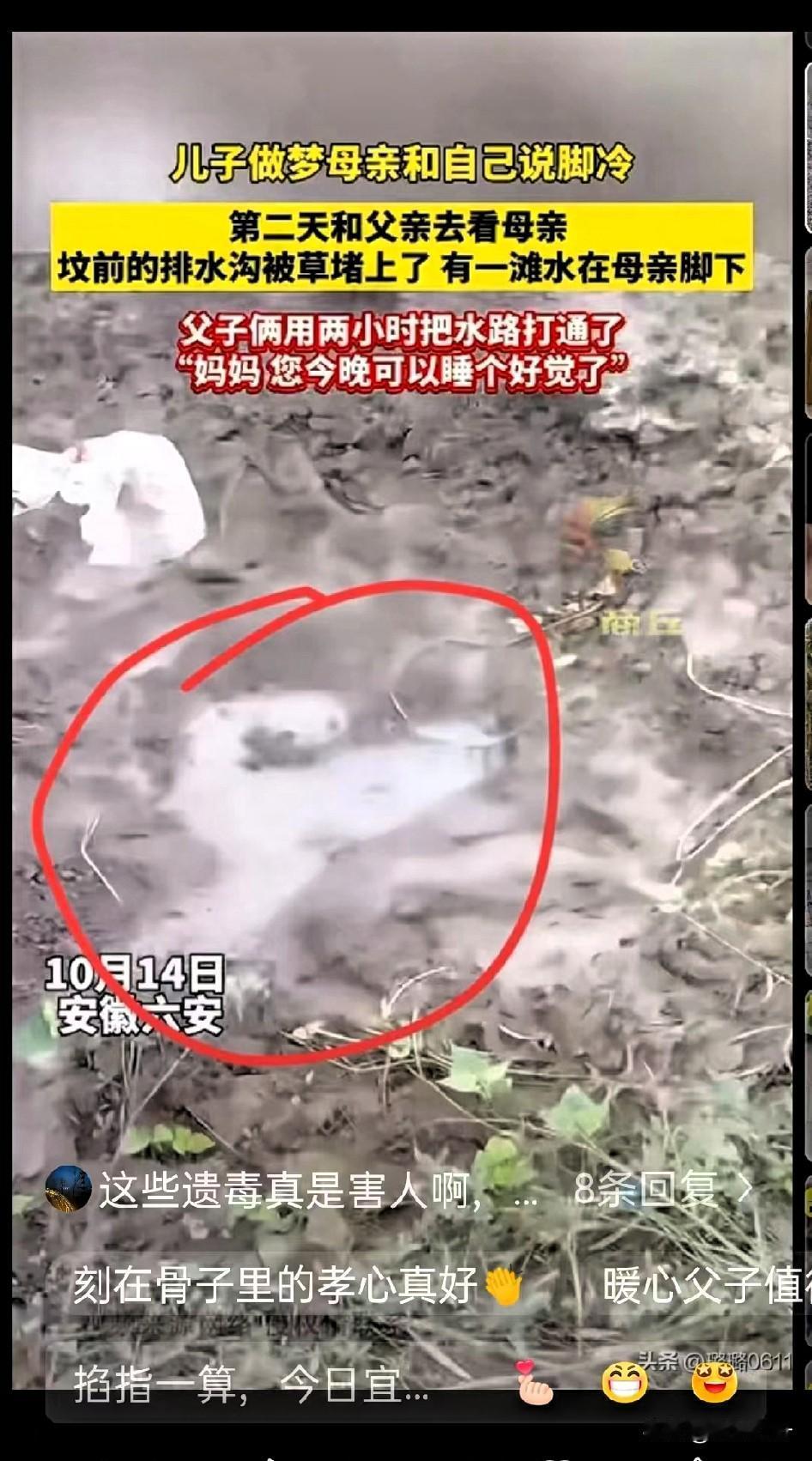 家人们谁懂啊!安徽六安一儿子做梦,妈妈跟他说脚冷。 让他翻来覆去睡不着,天刚蒙蒙亮,就拉着父亲往母亲坟地赶。 到了地方一看,眼眶瞬间就红了——坟前的排水沟被杂草和淤泥堵得死死的,前几天下雨积的水,刚好在墓碑下方汇成一滩,可不就像母亲“脚泡在冷水里”! 父子俩没多说一句话,直接蹲在地上忙活起来。野草长得密,他们就徒手拔,指尖被草刺扎出血也不在意;淤泥黏得牢,就用树枝一点点挖,汗水顺着脸颊往下淌,后背的衣服都湿透了。 整整两个小时,两人硬是把堵塞的水路疏通干净,看着积水顺着沟渠慢慢流走,坟前终于干爽了,父子俩才松了口气,对着坟头轻声说:“妈,这下不冷了,你踏踏实实睡。” 有人说这是“母子连心的奇迹”,可我觉得,哪是什么奇迹,不过是刻在骨子里的牵挂。比起死后大摆宴席、搞风光排场,这种把母亲的“心愿”(哪怕是梦里的)当真,立刻行动的模样,才是最动人的孝心。 真正的思念,从不是做给外人看的表演,而是哪怕天人永隔,也把她的冷暖记在心上。为这对暖心父子点赞!
