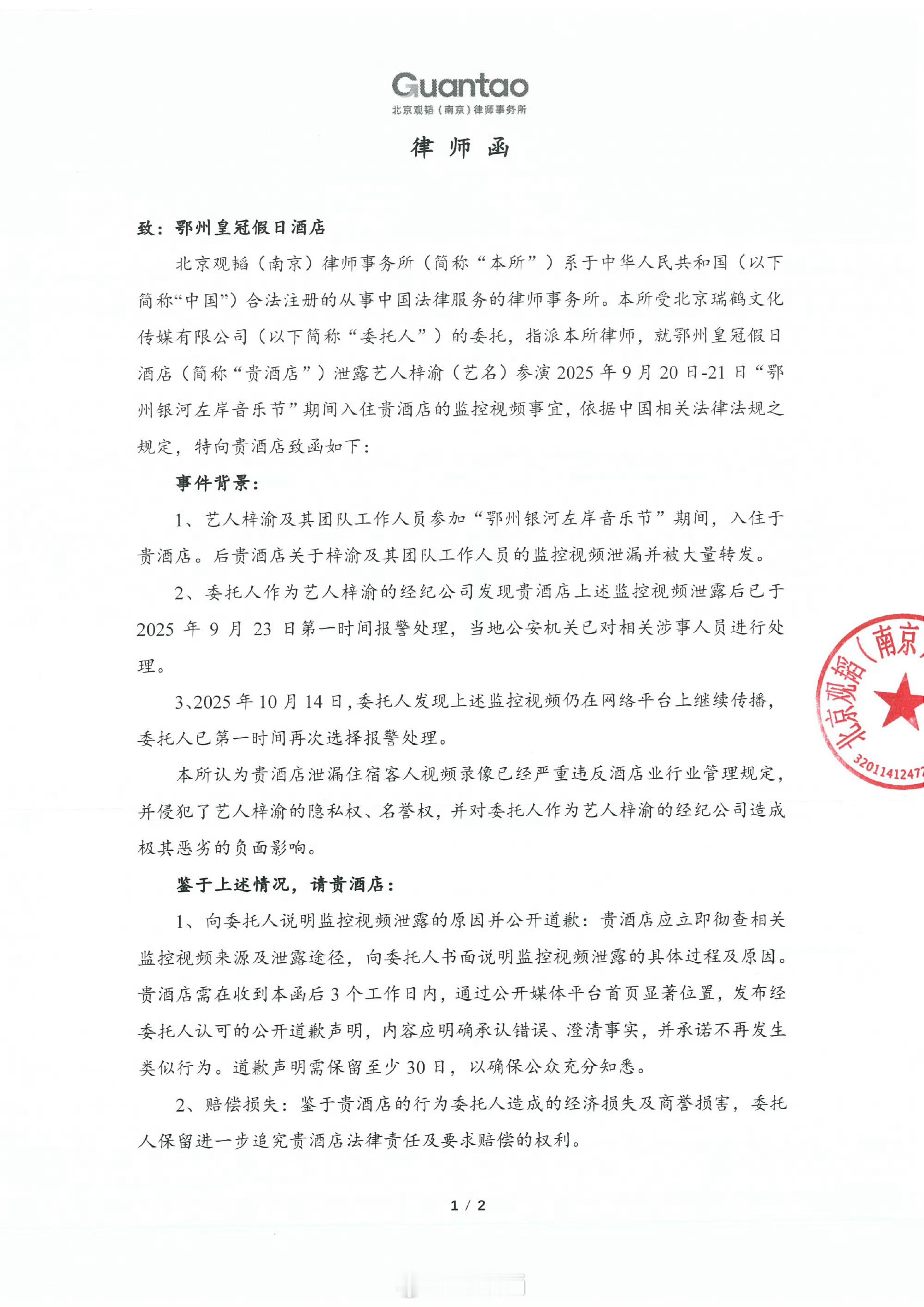 瑞鹤娱乐发了关于梓渝先生隐私被恶意侵害泄露事件的律师函