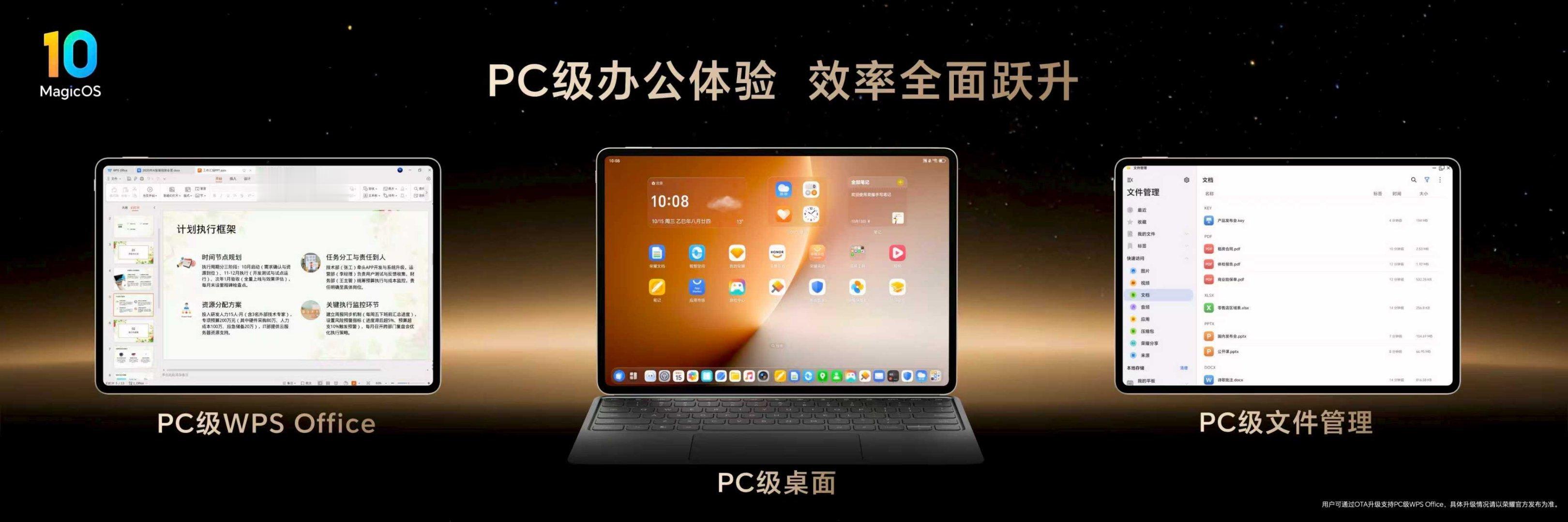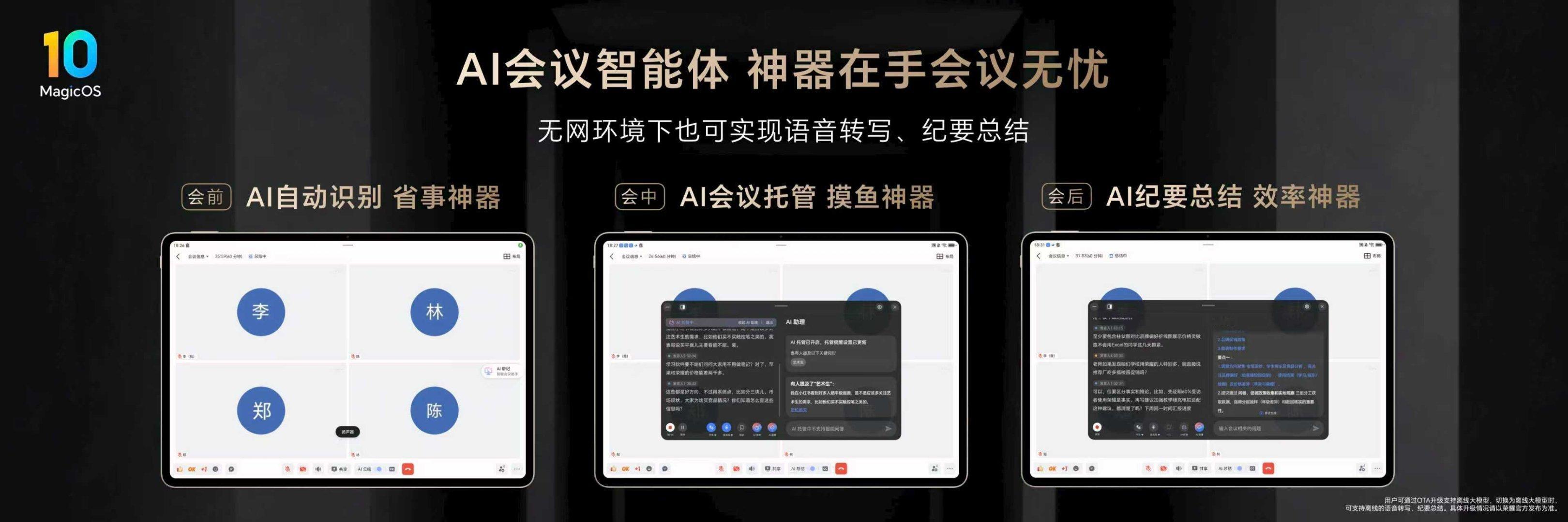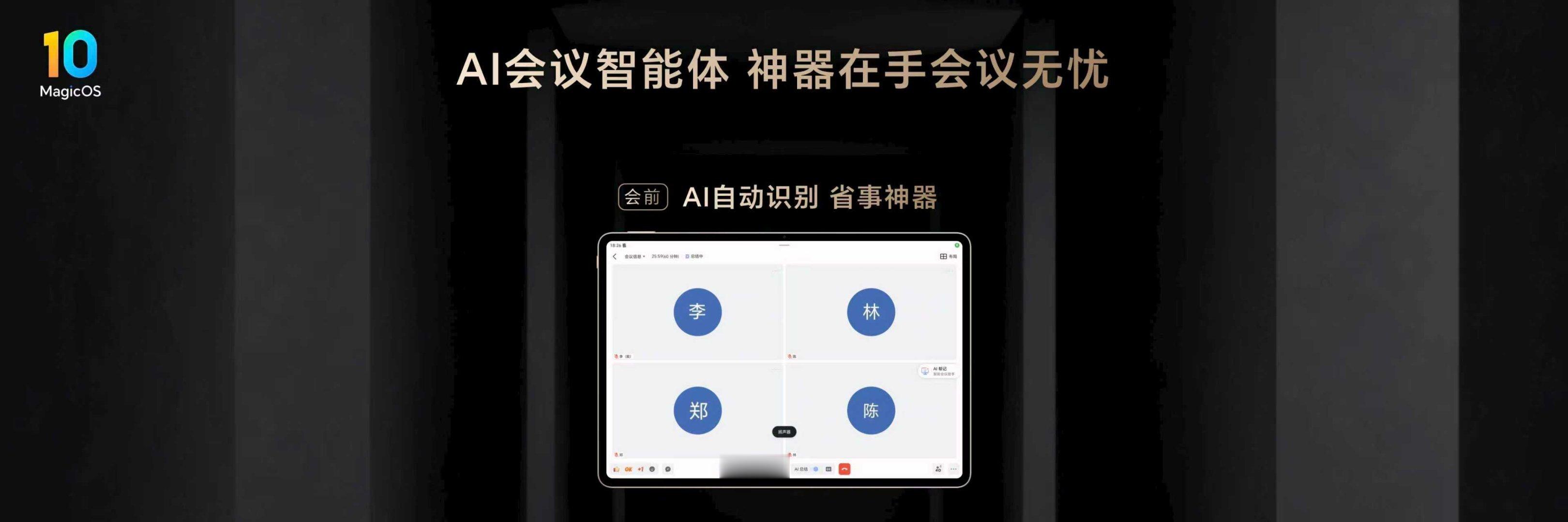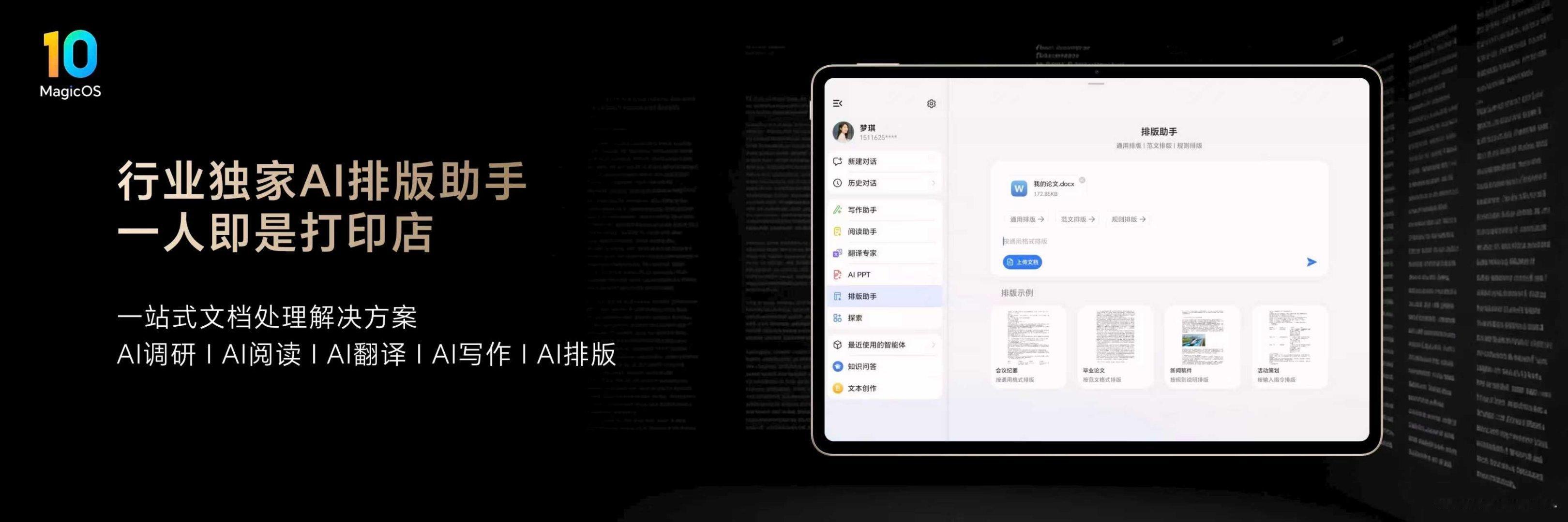 MagicOS 10实现PC级办公体验,行业独家支持一键排版,AI会议实时生成纪要及待办事项,智能识屏即时响应查询,AI体验全面升级。