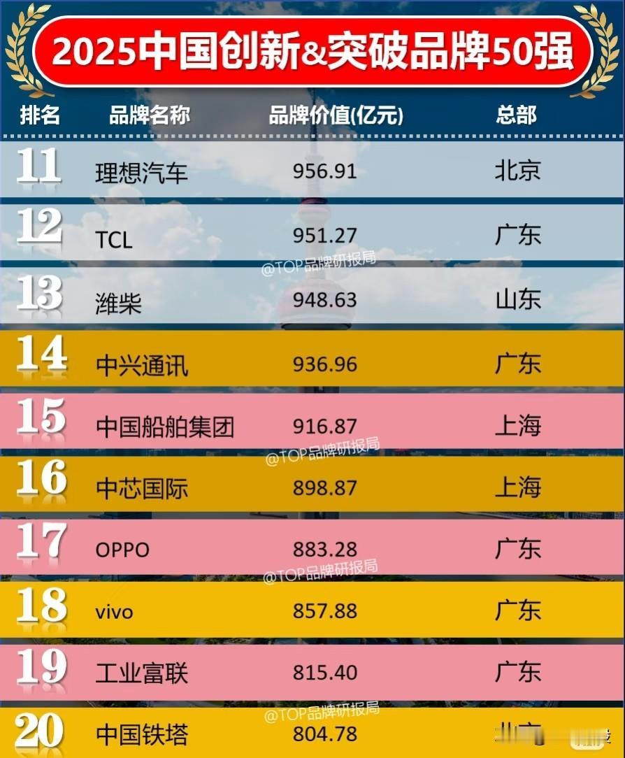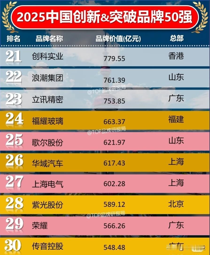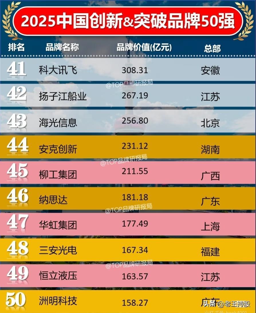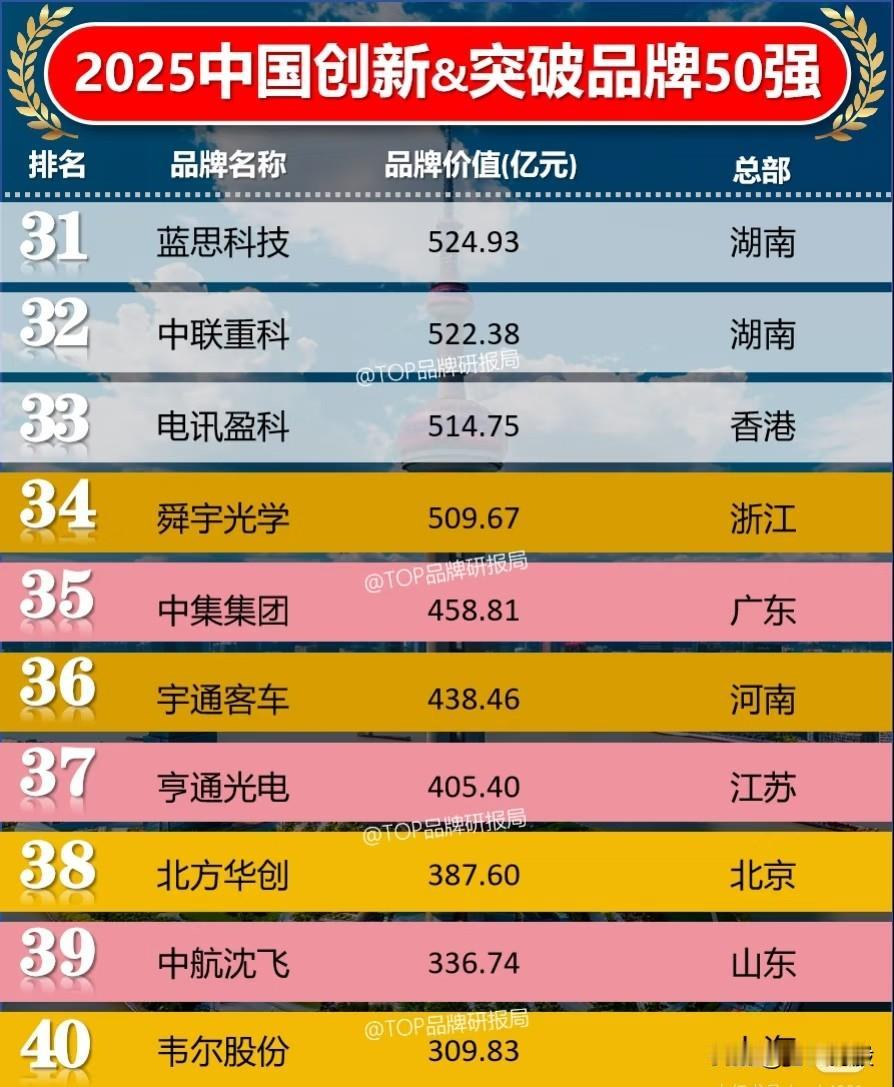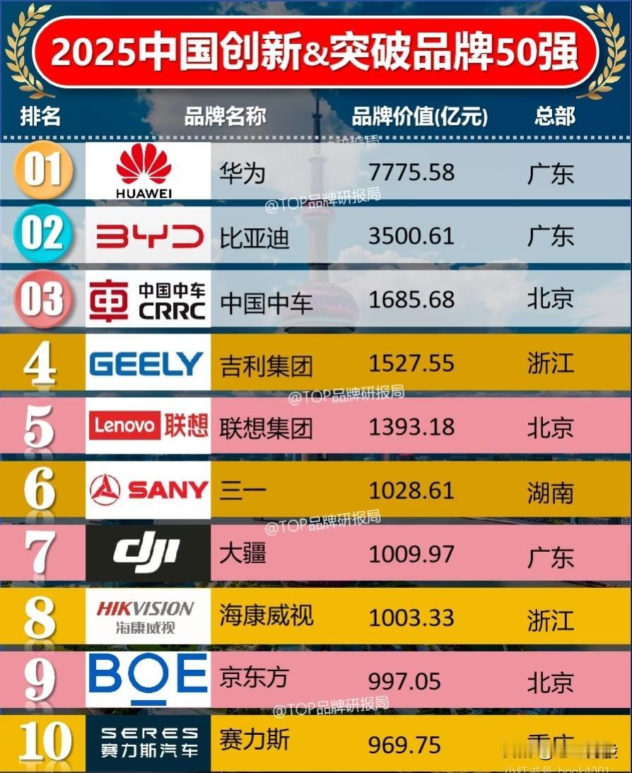 《2025中国创新&突破品牌50强》的榜单: 一、榜单头部品牌(1—10名) 榜单前10名均为品牌价值较高的行业龙头企业,大多来自广东、北京、浙江等地,涵盖通信、电子、新能源汽车、高端制造等领域: 1. 华为(广东):品牌价值 7775.58亿元,位居榜首,是榜单中价值最高的企业。 2. 比亚迪(广东):品牌价值 3500.61亿元,排名第2,代表中国新能源汽车与电池技术领先力量。 3. 中国中车(北京):品牌价值 1685.68亿元,专注于轨道交通装备。 4. 吉利集团(浙江):品牌价值 1527.55亿元,知名汽车及出行品牌。 5. 联想(北京):品牌价值 1393.18亿元,全球知名IT与智能设备品牌。 6. 三一重工(湖南):品牌价值 1028.61亿元,工程机械制造龙头。 7. 大疆(广东):品牌价值 1009.97亿元,全球领先的无人机与影像技术企业。 8. 海康威视(浙江):品牌价值 1003.33亿元,安防监控设备与解决方案提供商。 9. 京东方(北京):品牌价值 997.05亿元,全球显示面板与半导体显示技术重要企业。 10. 赛力斯汽车(重庆):品牌价值 969.75亿元,新能源汽车品牌,与华为有深度合作。 二、第11—20名(中高价值品牌) 这一区间品牌价值多在800亿~960亿之间,总部主要集中在广东、北京、上海、山东等地,涉及新能源汽车、家电、通信、芯片、重工等领域: - 理想汽车(北京):956.91亿元 - TCL(广东):951.27亿元 - 潍柴(山东):948.63亿元 - 中兴通讯(广东):936.96亿元 - 中国船舶集团(上海):916.87亿元 - 中芯国际(上海):898.87亿元(中国半导体制造重要企业) - OPPO(广东):883.28亿元 - vivo(广东):857.88亿元 - 工业富联(广东):815.40亿元(富士康旗下,智能制造与代工巨头) - 中国铁塔(北京):804.78亿元(通信基础设施服务) 三、第21—30名(品牌价值约500亿~780亿) 这一组品牌价值在500亿到近800亿之间,包括香港、广东、山东、福建、上海等地的企业,覆盖电子制造、玻璃、声学、精密制造、汽车零部件、电力设备等领域: - 创科实业(香港):779.55亿元 - 浪潮集团(山东):761.39亿元(IT基础设施与服务器) - 立讯精密(广东):753.85亿元(苹果供应链重要企业) - 福耀玻璃(福建):663.37亿元(全球汽车玻璃领导品牌) - 歌尔股份(山东):621.97亿元(声学与智能硬件) - 华域汽车(上海):617.43亿元(汽车零部件) - 上海电气(上海):602.28亿元(能源与工业装备) - 紫光股份(北京):589.12亿元(IT与云计算) - 荣耀(广东):566.26亿元(智能手机品牌) - 传音控股(广东):548.48亿元(非洲等新兴市场手机品牌) 四、第31—40名(品牌价值约300亿~530亿) 品牌价值多处于400亿~530亿区间,包括湖南、香港、浙江、江苏、河南、北京、上海等地的企业,涉及光学、通信、重工、半导体、客车、光缆等领域: - 蓝思科技(湖南):524.93亿元 - 中联重科(湖南):522.38亿元(工程机械) - 电讯盈科(香港):514.75亿元(通信与媒体) - 舜宇光学(浙江):509.67亿元(光学镜头与影像) - 中集集团(广东):458.81亿元(集装箱与物流装备) - 宇通客车(河南):438.46亿元(客车制造) - 亨通光电(江苏):405.40亿元(光纤光缆) - 北方华创(北京):387.60亿元(半导体设备) - 中航沈飞(山东):336.74亿元(航空制造) - 韦尔股份(上海):309.83亿元(半导体设计) 五、第41—50名(品牌价值约150亿~310亿) - 科大讯飞(安徽):308.31亿元(人工智能与语音技术) - 扬子江船业(江苏):267.19亿元(造船) - 海光信息(北京):256.80亿元(芯片) - 安克创新(湖南):231.12亿元(消费电子品牌) - 柳工集团(广西):211.55亿元(工程机械) - 纳思达(广东):181.18亿元(打印与芯片) - 华虹集团(上海):177.49亿元(半导体制造) - 三安光电(福建):167.34亿元(LED与化合物半导体) - 恒立液压(江苏):163.57亿元(液压元件) - 洲明科技(广东):158.27亿元(LED显示与照明)
