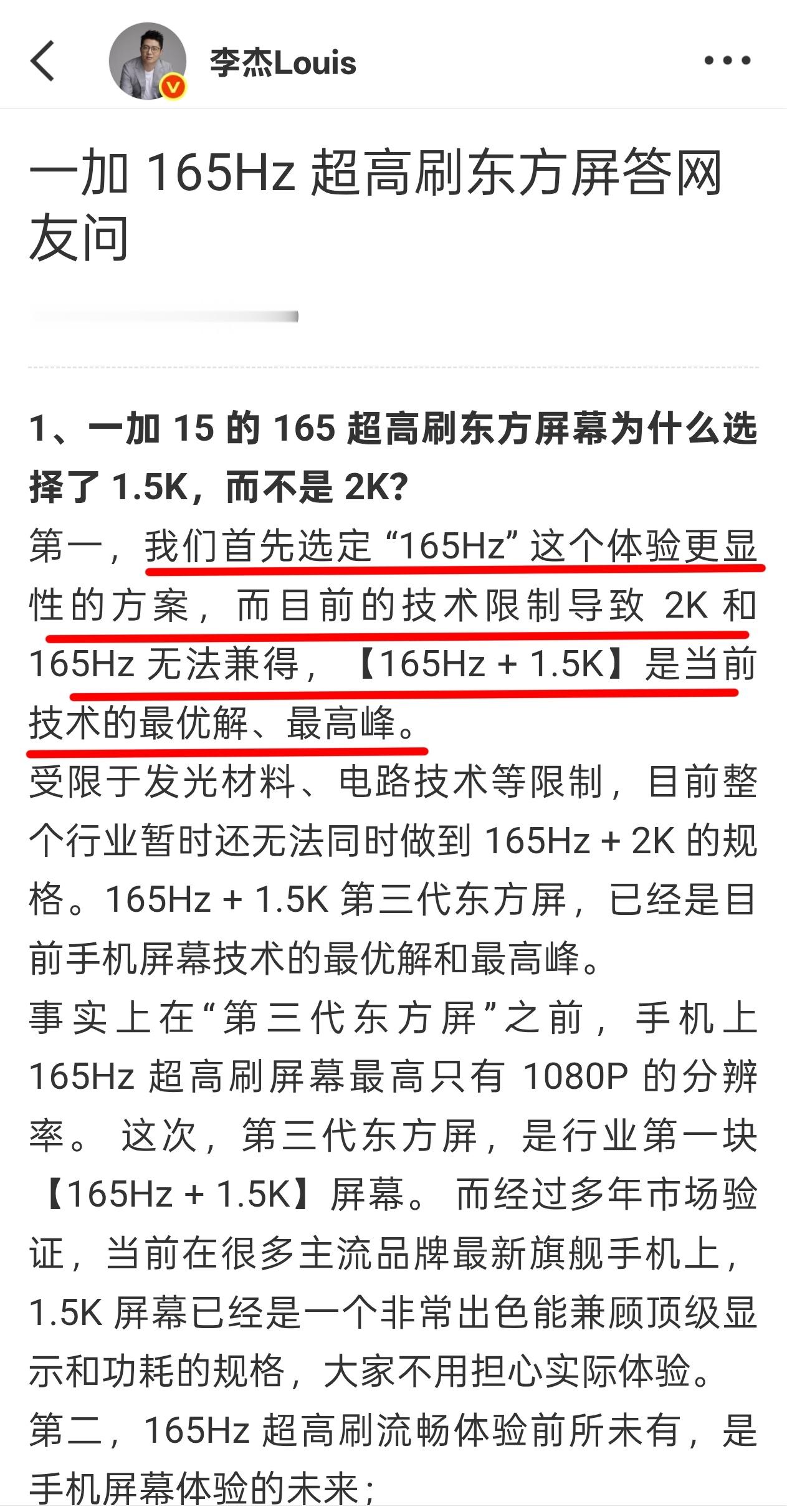 李杰还是这么实在,“165Hz+1.5K 是当前技术最优解”