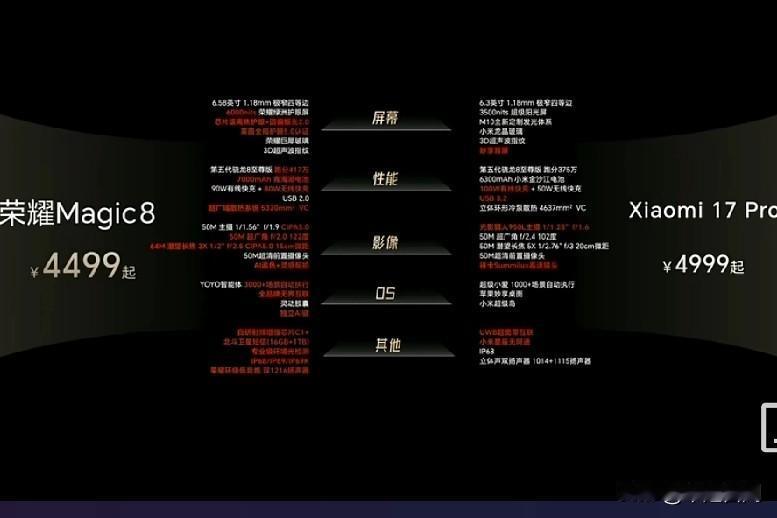 荣耀Magic8终于发布了吊打友商,4499的价格你能接受吗? 骁龙8五代芯片,对比是苹果17和小米17,从游戏性能,拍照体验,照片美化,续航比他们多两小时,发热管控也是同级别最好,跑分同级别300多万,荣耀8 4百多万跑分,荣耀手机专注研发手机,考虑护眼,考虑了使用手感等等,可以说今年最优选择。