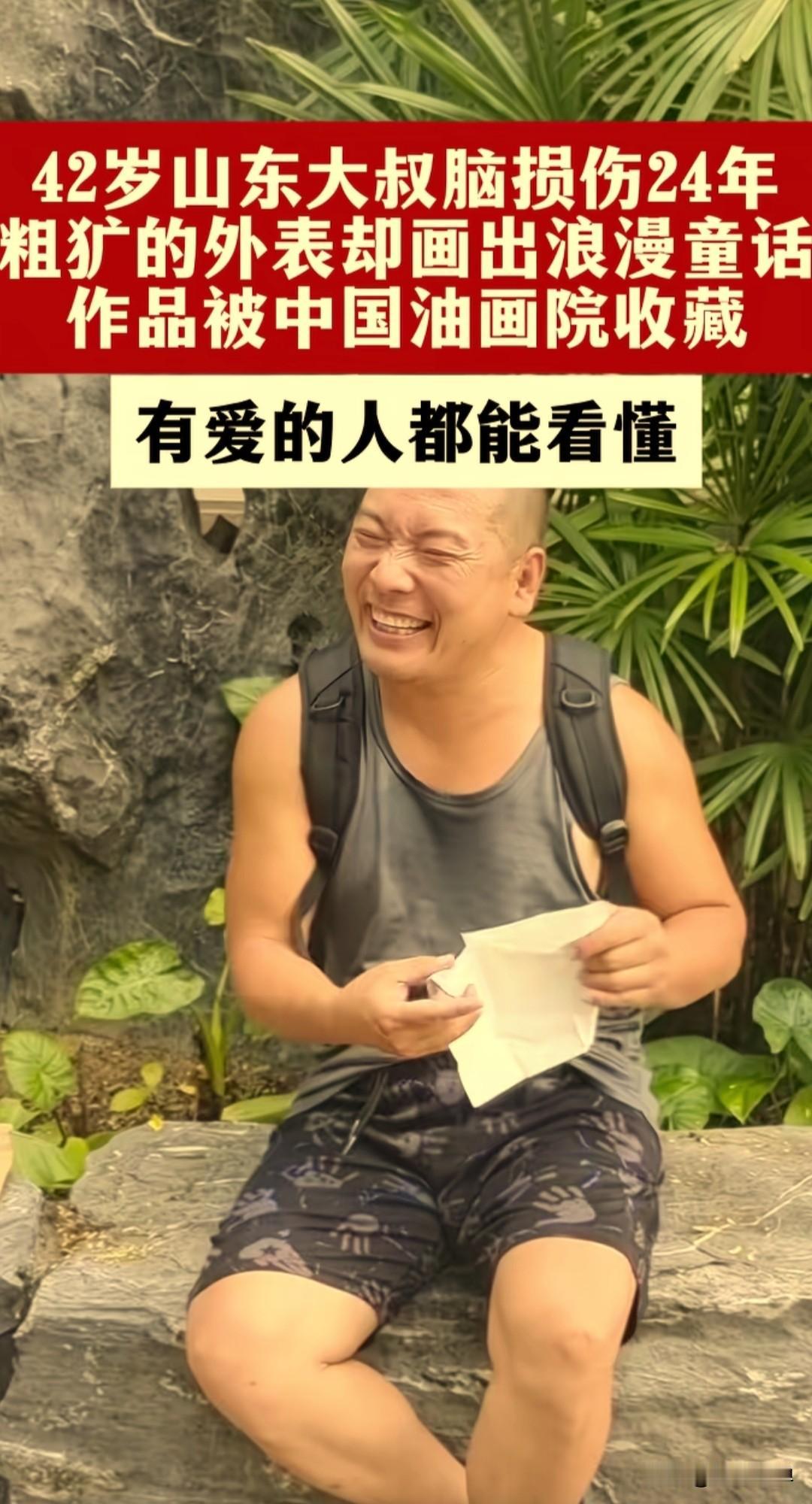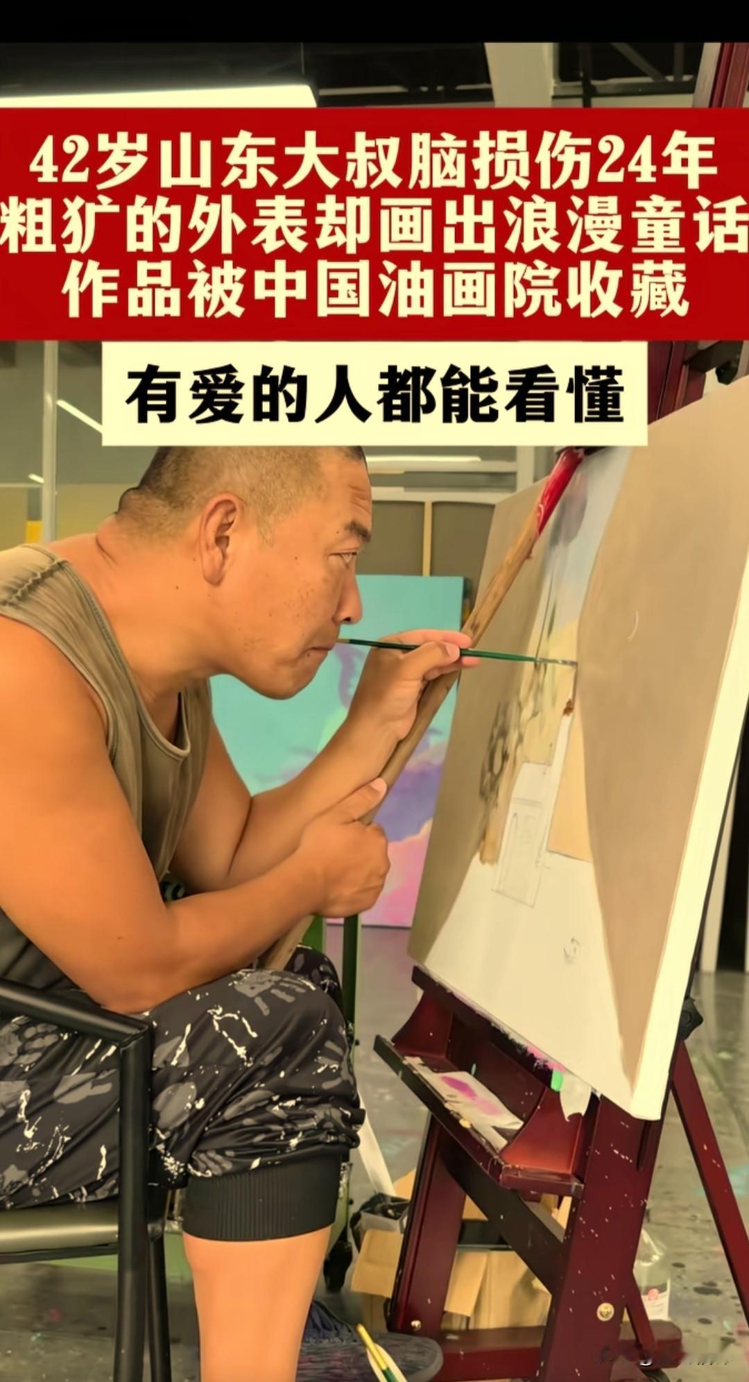 42岁山东大叔脑损伤20余年, 粗犷的外表画出浪漫童话,没上过美院,靠着一份热爱,作品被中国油画院收藏。 来自青岛的赵仕伟,21岁时因一场高烧,没钱看病,导致脑神经严重受损,影响语言、行走和进食功能。 他没有向生活低头,之前因为喜欢上了一个女孩,便开始画画,这一画就是24年,作品纯净、治愈,充满童话色彩。 他的作品《克制的力量——渔船》被中国油画院收藏,他的经历也被医学领域关注,有分析指出,绘画这类艺术活动能够激活大脑相关功能区,促进神经突触重建,对改善脑损伤患者的视觉空间认知和心理状态有积极的作用。 网友说:我不懂画,但是看了他的画,能感受到这个世间的美好,让我内心激动,唤起最纯真的心,对自己说一句,你好这个世界! 好喜欢你的画,干净、纯洁、梦幻,像是个没有被污染过的世界!