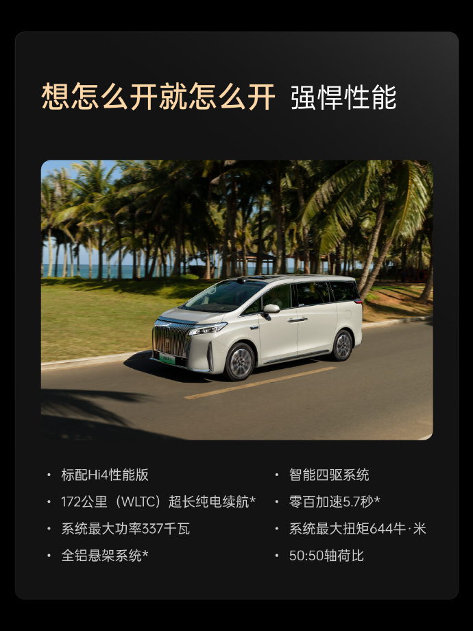 从大配置上来看,其实高山家族的整体区别不大,像动力配置、车身结构用料、灵动转向功能、智驾配置,几乎是没有差别,只需要找准自己的空间需求和用车场景,就能选到合适的高山。