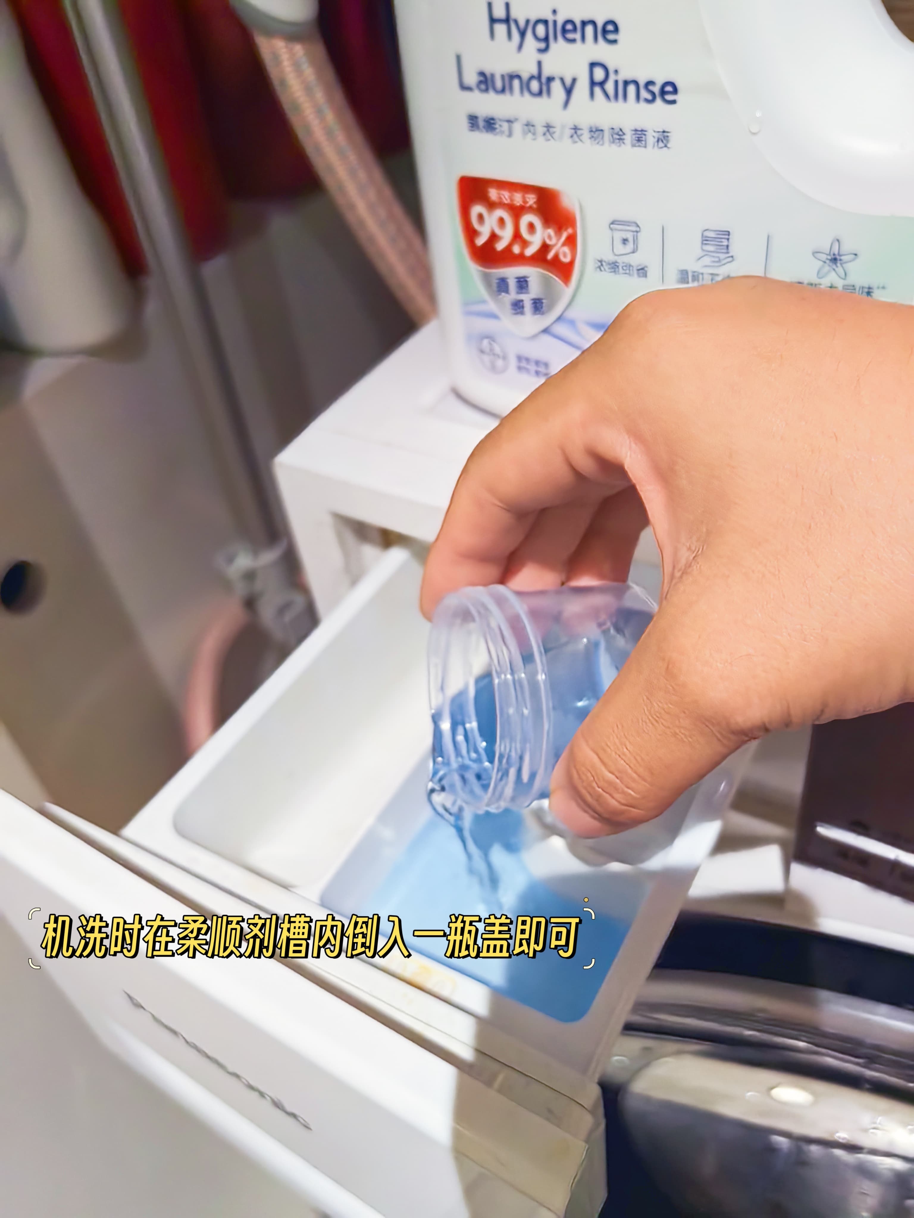 2、每次把除菌液放在柔顺剂口,剩下的就交个洗衣机办就行。没有柔顺剂口的,可以在漂洗程序加一瓶盖即可!