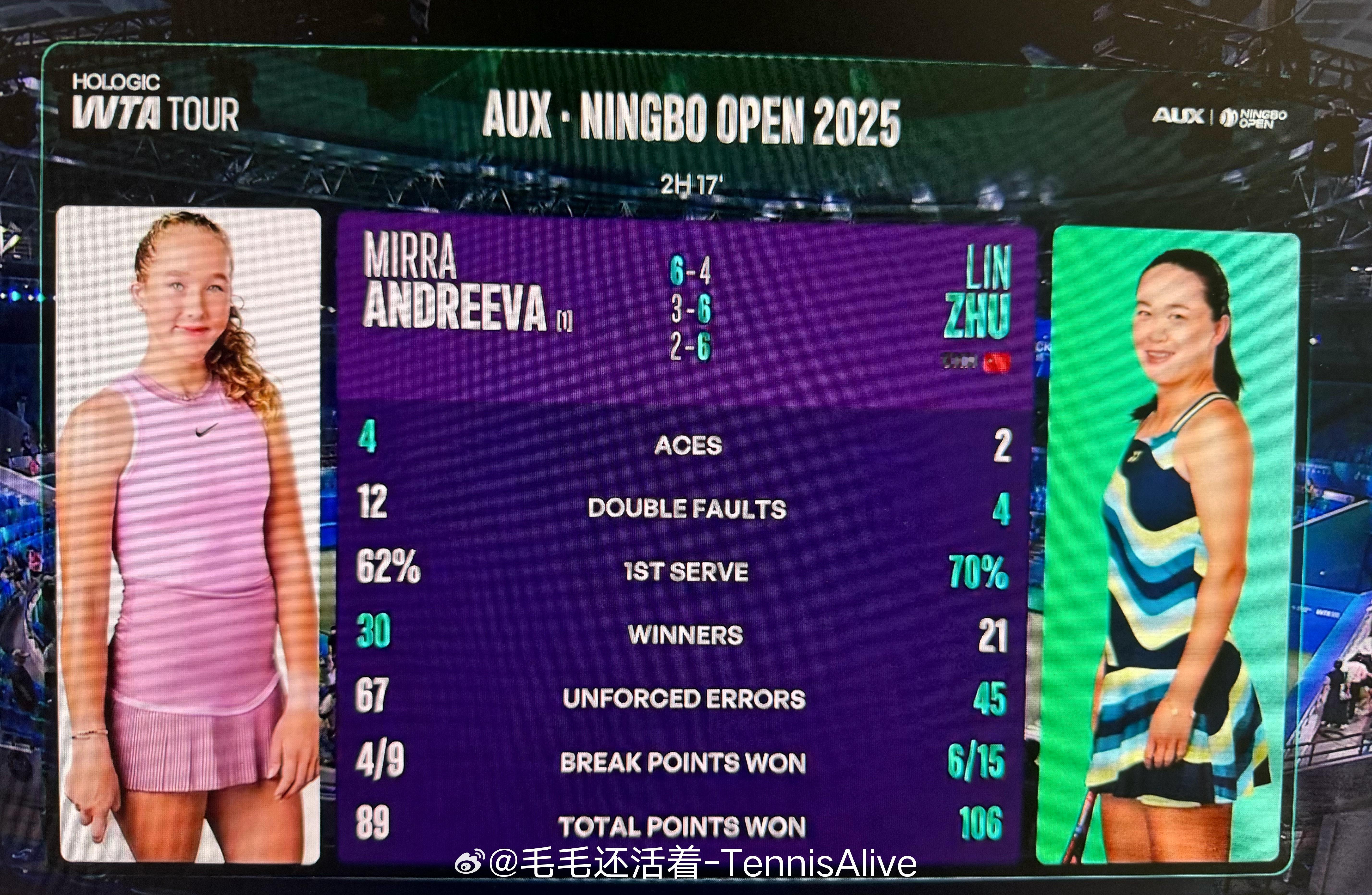 就像赛后朱琳说的那样,朱琳今天打得很勇敢。上次打得太保守了,今天从头到尾都很攻。底线回球很深,击球很快。在小米辣犹豫不决的时候,朱琳的果断下手的进攻就很有效。全场比赛小米辣打出67非受迫性失误,但是只有30记制胜分。这样的她拿不下比赛。