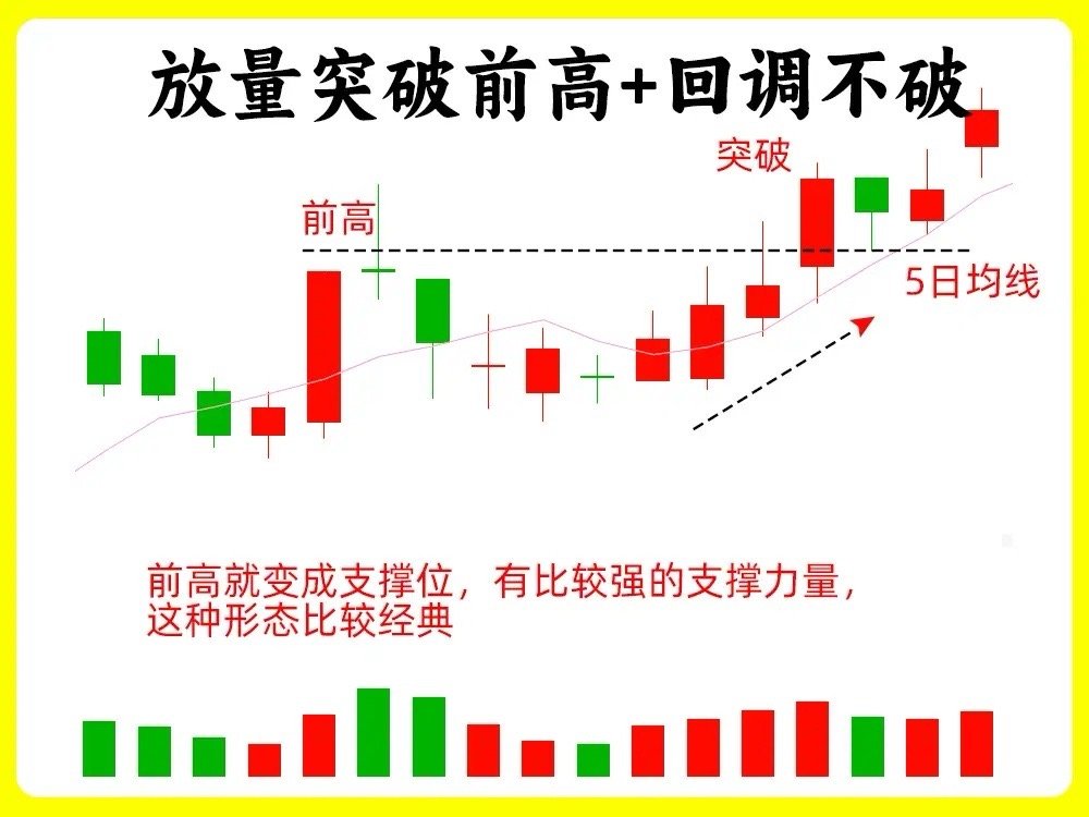 这种形态会出现地方横盘突破的阶段或是上涨趋势的初期中期。股价经过一段上涨以后,开始回调,缩量调整,随后继续向上,出现放量突破前高,随后开始回调,回调在前期高点的位置开始止跌反弹向上。股价突破前高的时候,前高有大量的套牢盘,也就是压力,等突破以后回调,前高就变成支撑位,有比较强的支撑力量,这种形态比较经典,走势上看,就一个波浪式的上涨