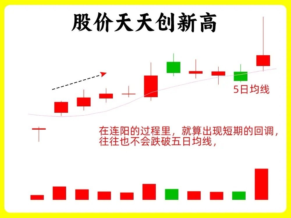 股价在上涨趋势当中,股价一路上涨,五日均线同步向上,随后股价开始回调,到了五日均线附近开始止跌向上,回调不破五日均线,同时五日均线并没有拐头向下。五日均线被大家看成攻击线,也是五个交易日里,市场的平均持仓成本。所以回调不破五日均线,说明短期里多方力量比较强,均线有一定支撑力量