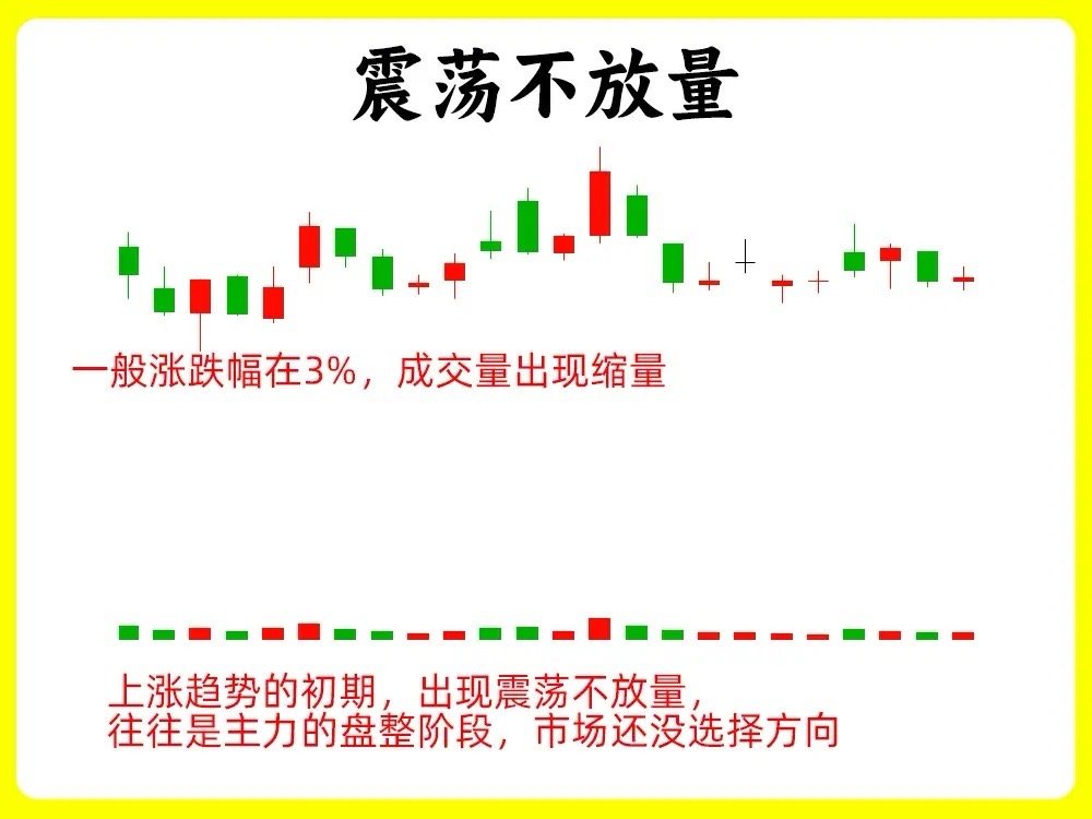 股价经过一波上涨以后,股价开始横盘震荡,一般涨跌幅在3%,成交量出现缩量。很多散户有一个误区,成交量放量,其实也代表者市场分歧有人买有人买,缩量说明交易不活跃,市场分歧小。上涨趋势的初期,出现震荡不放量,往往是主力的盘整阶段,市场还没选择方向。如果是在高位出现,那很有可能上涨动力不足,主力在偷偷出货