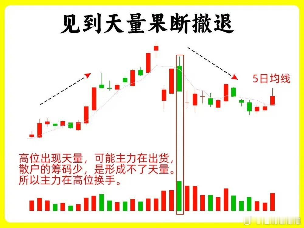 刚刚前面我就说,成交量的大小也代表市场的分歧的大小。股价在高位出现天量,成交量是一轮上涨阶段里,最大的量,有买有卖才能成交,高位出现天量,可能主力在出货了,散户的筹码少,是形成不了天量。所以主力在高位换手。高位天量和低位天量的逻辑是不同,低位往往是主力强势建仓。