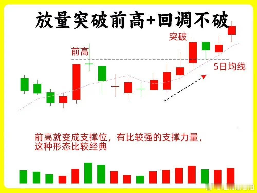 这种形态会出现地方横盘突破的阶段或是上涨趋势的初期中期。股价经过一段上涨以后,开始回调,缩量调整,随后继续向上,出现放量突破前高,随后开始回调,回调在前期高点的位置开始止跌反弹向上。股价突破前高的时候,前高有大量的套牢盘,也就是压力,等突破以后回调,前高就变成支撑位,有比较强的支撑力量,这种形态比较经典,走势上看,就一个波浪式的上涨