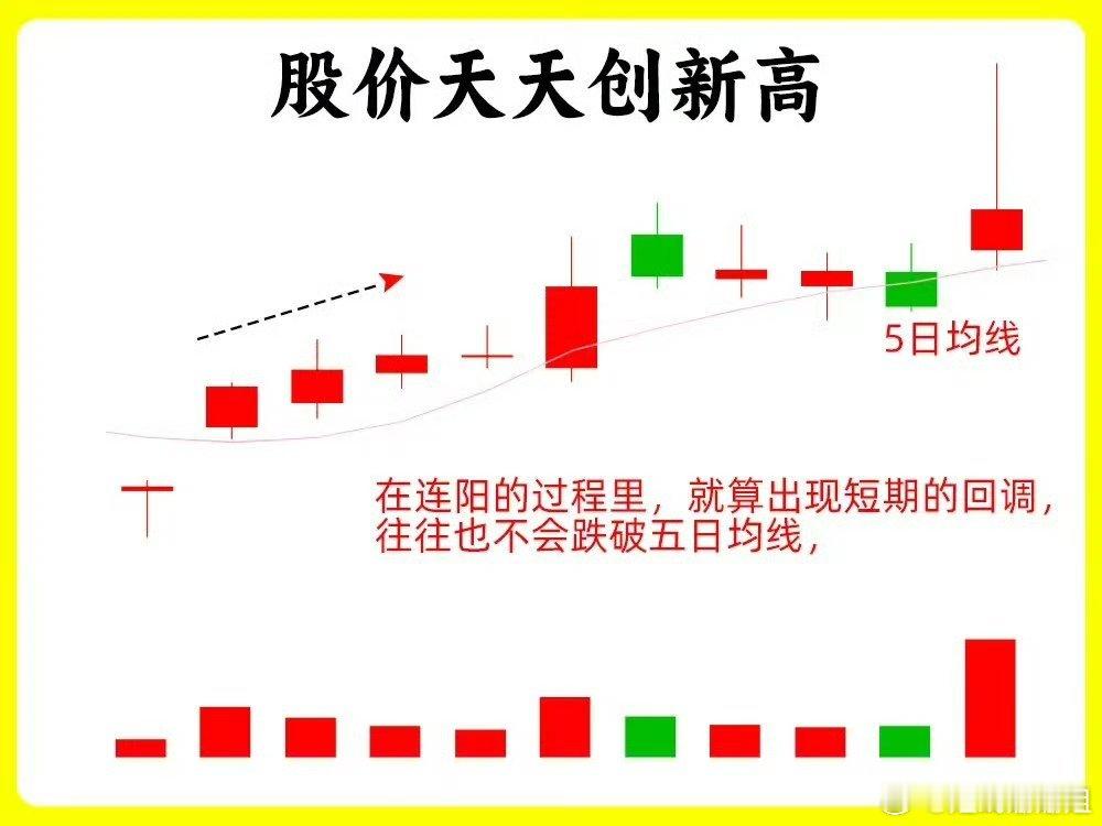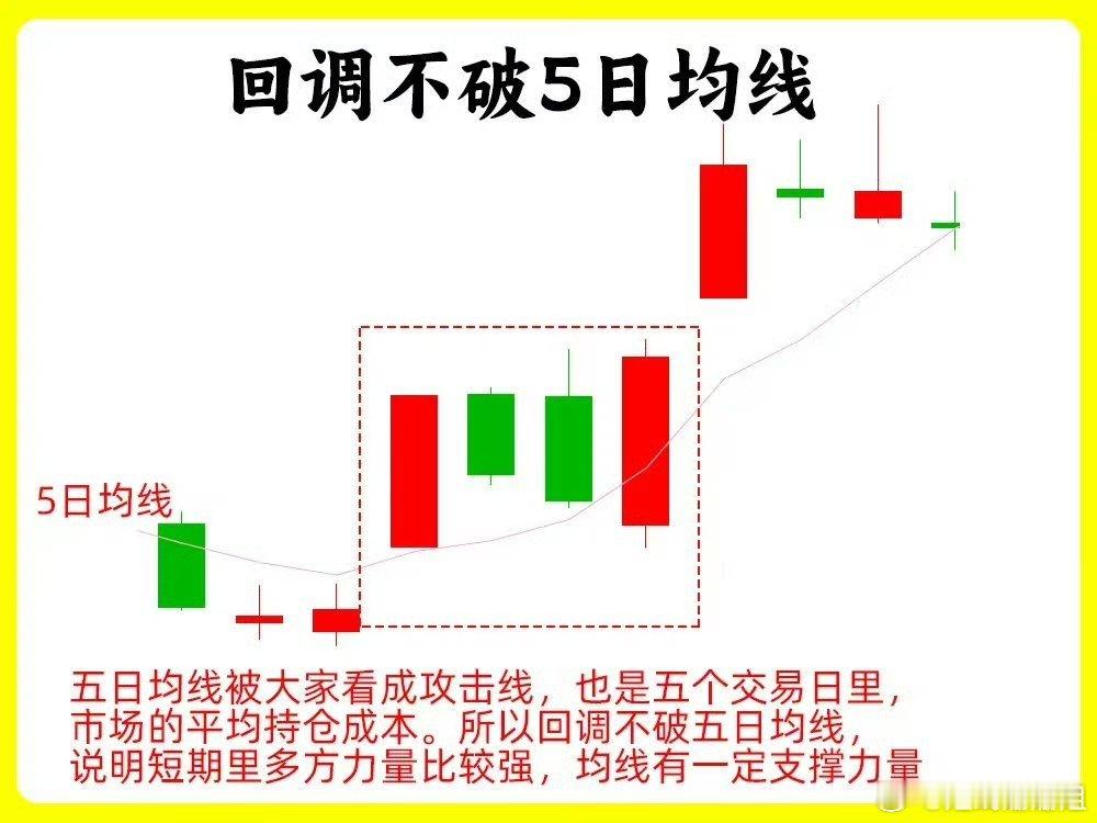 股价在上涨趋势当中,股价一路上涨,五日均线同步向上,随后股价开始回调,到了五日均线附近开始止跌向上,回调不破五日均线,同时五日均线并没有拐头向下。五日均线被大家看成攻击线,也是五个交易日里,市场的平均持仓成本。所以回调不破五日均线,说明短期里多方力量比较强,均线有一定支撑力量