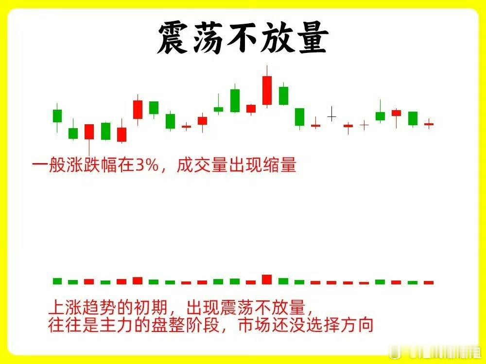 股价经过一波上涨以后,股价开始横盘震荡,一般涨跌幅在3%,成交量出现缩量。很多散户有一个误区,成交量放量,其实也代表者市场分歧有人买有人买,缩量说明交易不活跃,市场分歧小。上涨趋势的初期,出现震荡不放量,往往是主力的盘整阶段,市场还没选择方向。如果是在高位出现,那很有可能上涨动力不足,主力在偷偷出货