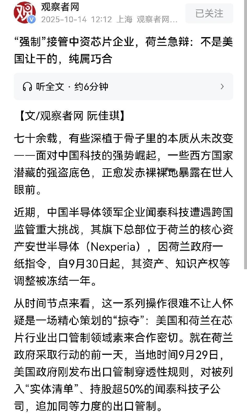 这下傻眼了吧! 被荷兰强制接管的安世半导体,终于知道疼了。 前脚刚配合老美把我们卡脖子,后脚就出来澄清,说接管这事纯属巧合,跟美国没关系。这话说出来,他们自己信吗? 说白了,就是慌了。公司七八成的业务都在咱们这,一纸禁令下去,半条命没了。这还没算稀土这张王牌呢,真要动起来,那才叫前途渺茫。 所以说,打蛇就得打七寸。当初为了点虚无缥缈的“技术安全”,跟着美国瞎起哄,就没想过后果? 未来这种事只会多不会少,任何想跟着美国玩火的,都得先掂量掂量自己的家底到底在哪。全球化时代,谁也离不开谁。 #国际#