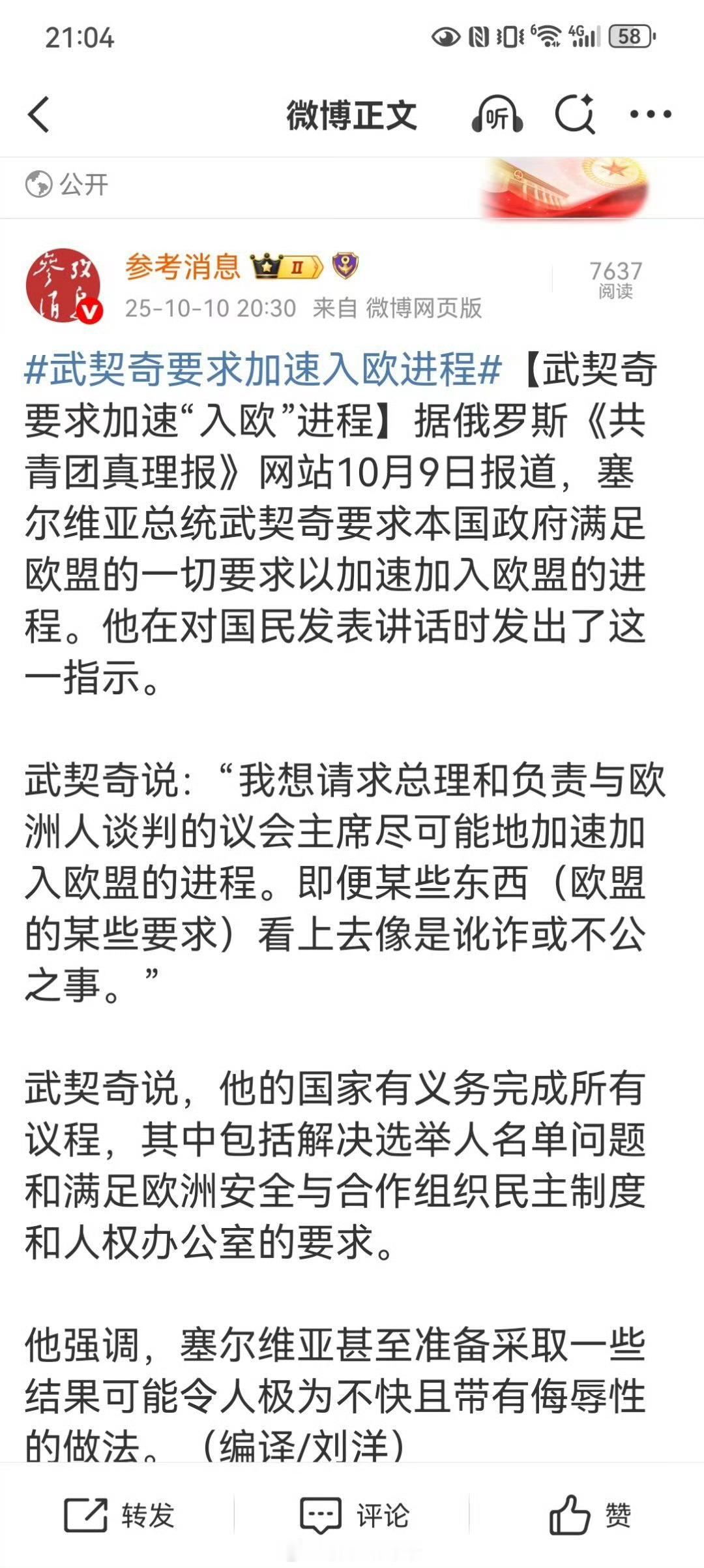 武契奇要求加速入欧进程【武契奇要求加速“入欧”进程】武契奇说:“我想请求总理和负责与欧洲人谈判的议会主席尽可能地加速加入欧盟的进程。即便某些东西(欧盟的某些要求)看上去像是讹诈或不公之事。