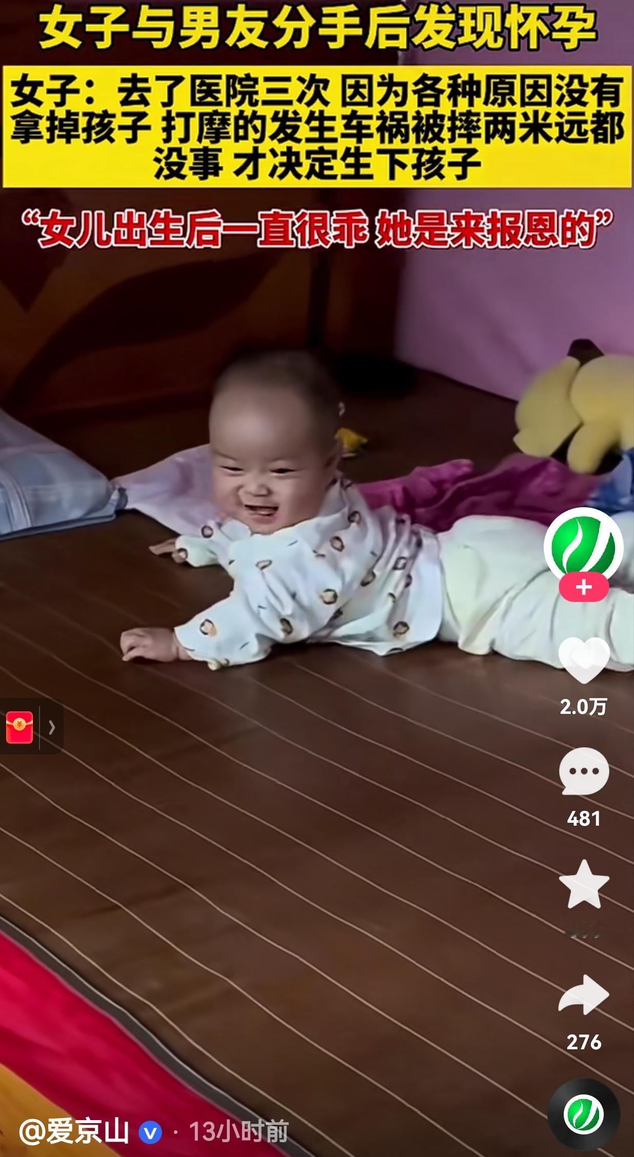 太有勇气了!女子与男友分手后发现自己已经怀孕了! 女子本来想着把孩子打掉,因为各种原因没有拿掉孩子,怀孕期间,打摩的发生车祸被摔了两米远,孩子都没有事。女子看到孩子的生命力这么顽强,暗暗下定决心,干脆把孩子生下来吧? 孩子出生后,一直很乖,只要孩子吃饱了,一点也不闹人。 孩子看到妈妈,就会不停地傻笑女子说:“她是来报恩的。” 网友看到后评论说,妈妈有多大的勇气,才敢独自一人将孩子生下来。 还有的网友说,这孩子跟你缘分很深,赶都赶不走,以后肯定很孝顺。 一个人独自抚养孩子,又当爹又当妈,还要给养活孩子的真挺不容易。不知道女生的父母会不会帮忙照顾,如果父母能帮衬一点还好,万一父母不愿意帮助,还挺难的呢? 所以说,女孩子可以谈恋爱,但是,一定要做好防护措施,婚前不要太放肆了!因为,本来可以避免,却因为自身的原因,导致自己怀孕,这不是自作自受吗? 既然孩子已经出生了,那就好好把孩子养大成人吧!我相信你熬过这个难关,以后肯定会越来越好的。加油!