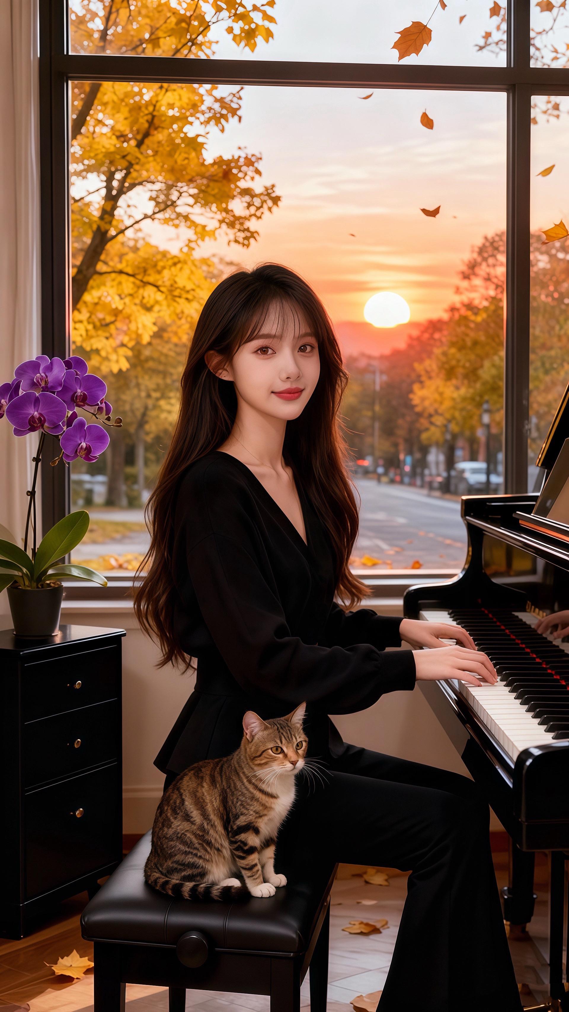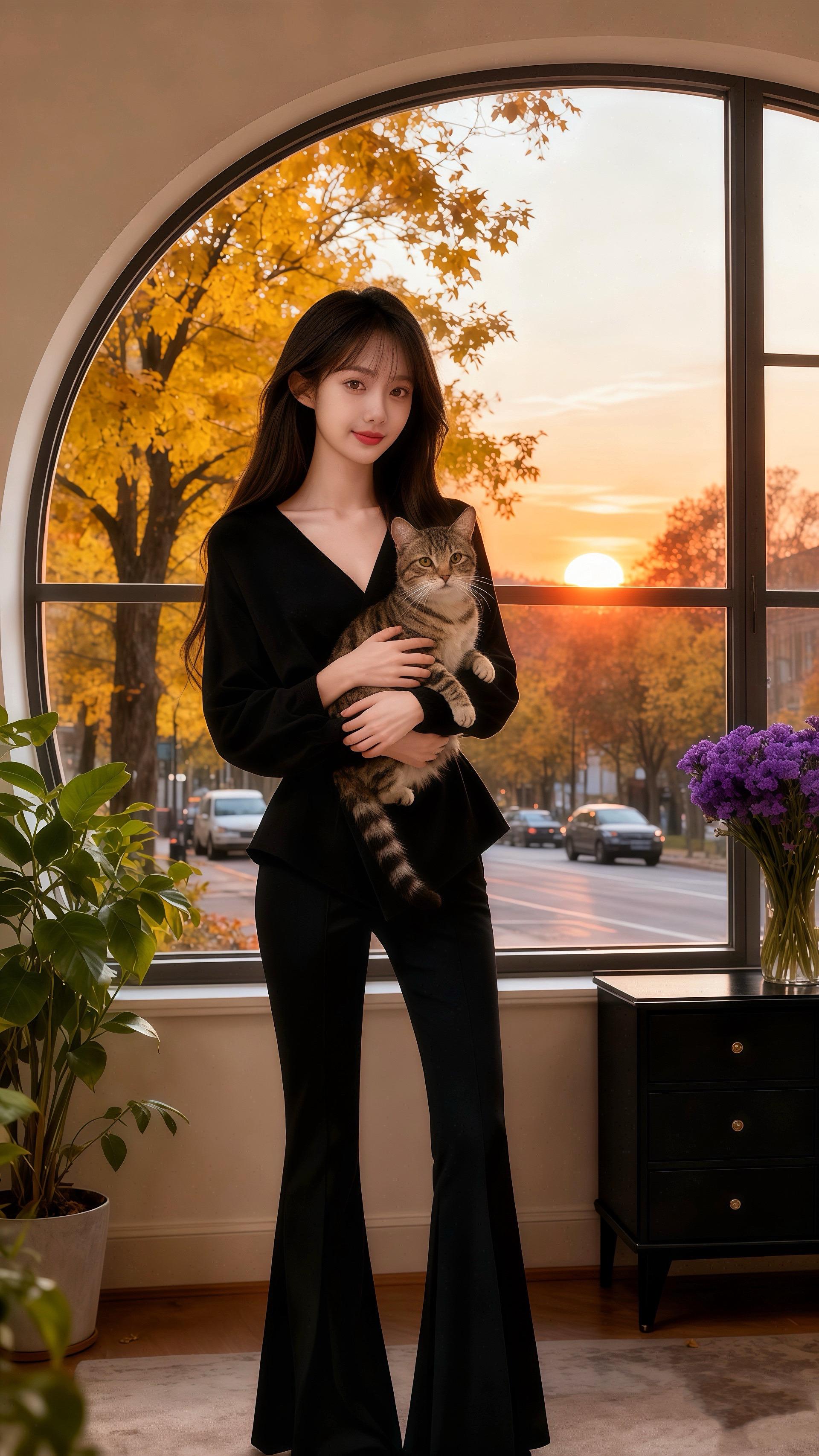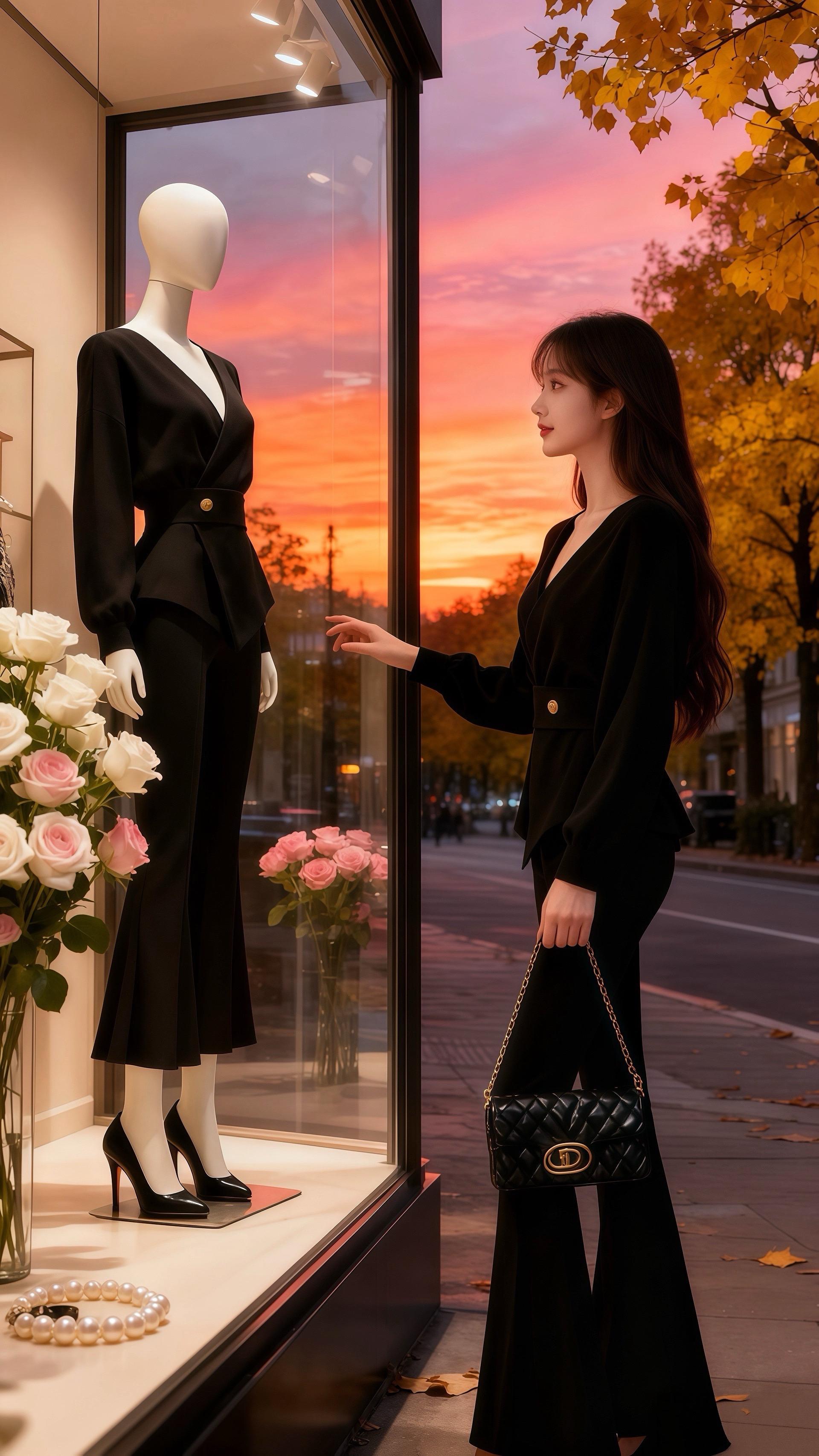 秋日黄昏,画室的弧形窗将余晖裁成温柔的金箔,洒在许妍身上。她正对着画架上的肖像专注调色,黑色套装的收腰设计衬得她身姿窈窕,皓明推门进来时,目光瞬间被她锁住。 “这幅自画像,不及你本人万分之一美。”皓明走上前,指尖拂过她柔顺的长发,“尤其是你这身穿搭,简约又优雅,把你的气质衬得恰到好处。” 许妍脸颊微红,放下画笔转身,撞进他含笑的眼眸里。窗外黄叶簌簌飘落,虎斑猫跳上画凳,亲昵地蹭着她的裤脚。 “今晚有个艺术沙龙,”皓明递过手包,“我特意空出时间,想做你的专属欣赏者。” 夜色渐浓,沙龙里的许妍成了焦点。