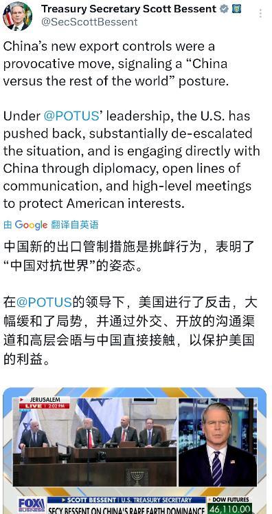 美国财政部长贝森特10月14日发文写道:“中国新的出口管制措施是挑衅行为,表明了‘中国对抗世界’的姿态。在特朗普总统的领导下,美国进行了反击,大幅缓和了局势,并通过外交、开放的沟通渠道和高层会晤与中国直接接触,以保护美国的利益。” 中国的出口管制措施始终遵循国际法和国际惯例,目的是维护全球产业链供应链的安全稳定,可不是什么“对抗世界”。反观美国,这些年在科技领域搞单边制裁、技术封锁,动辄对其他国家企业下黑手,那才是真的在破坏国际经贸秩序。 贝森特说特朗普政府“大幅缓和了局势”,这话听着就让人发笑。特朗普时期发起的贸易战,给中美两国经济都带来了不小冲击,美国农民失去中国市场,美国企业成本飙升,这些都是实打实的后果。所谓的“缓和局势”,不过是美国自欺欺人的说法。 美国口中的“反击”,本质上就是搞贸易保护主义。当初美国单方面对中国商品加征高额关税,中国被迫采取反制措施,这都是美国先挑起来的。现在倒好,中国依法实施出口管制,美国就跳出来指责是“挑衅”,这种双重标准也太明显了。 贝森特还提“通过外交、开放的沟通渠道和高层会晤与中国直接接触”,可事实是美国常常把沟通当成施压的手段。每次高层会晤前,美国总喜欢先抛出一些无理要求,达不到目的就威胁加码制裁,这哪里是“开放的沟通”? 中国一直重视中美沟通,但沟通必须建立在相互尊重、平等互利的基础上。美国不能一边喊着沟通,一边又在行动上不断损害中国利益。就拿科技领域来说,美国把中国多家企业列入“实体清单”,限制芯片等关键技术出口,这根本不是沟通的态度。 所谓“保护美国的利益”,美国的做法却是以损害中国利益和全球利益为代价。全球产业链供应链是相互依存的,美国搞脱钩断链,不仅让中国企业受损,也让美国本土企业和盟友企业深受其害。美国芯片行业因为对华出口限制,已经出现产能过剩、利润下滑的问题,这就是活生生的例子。 中国的出口管制措施不是针对谁,更不是“对抗世界”。中国始终是全球开放合作的坚定支持者,这些年不断扩大进口,优化营商环境,为世界经济发展作出了重要贡献。2024年中国货物贸易进出口总额达到46.7万亿美元,连续多年保持世界第一,这就是中国开放的最好证明。 美国应该清醒地认识到,搞单边主义、保护主义是没有出路的。贝森特的言论充满了冷战思维和零和博弈的错误观念,不利于中美关系的健康发展,也不利于全球经济的稳定。 中美作为世界前两大经济体,合则两利,斗则俱伤。美国如果真的想解决问题,就应该放弃指责和施压,拿出诚意和务实的态度,与中国通过平等对话协商,妥善处理分歧。 中国不会被美国的不实言论所误导,也不会在核心利益问题上让步。中国将继续坚定维护自身安全和发展利益,同时坚持对外开放,与世界各国共同推动全球产业链供应链稳定畅通,实现互利共赢。 贝森特试图把中国的合法举措抹黑成“挑衅”,这种做法只会暴露美国的霸权心态。国际社会看得很清楚,谁在维护国际秩序,谁在破坏国际规则。美国如果不改变这种错误做法,只会越来越孤立。 当下全球经济面临诸多挑战,中美两国更应该加强合作,而不是相互对抗。美国应该摒弃冷战思维,停止发表不实言论,与中国一道为世界经济复苏和发展贡献力量。这才是负责任大国应有的态度,而不是像现在这样颠倒黑白、混淆是非。
