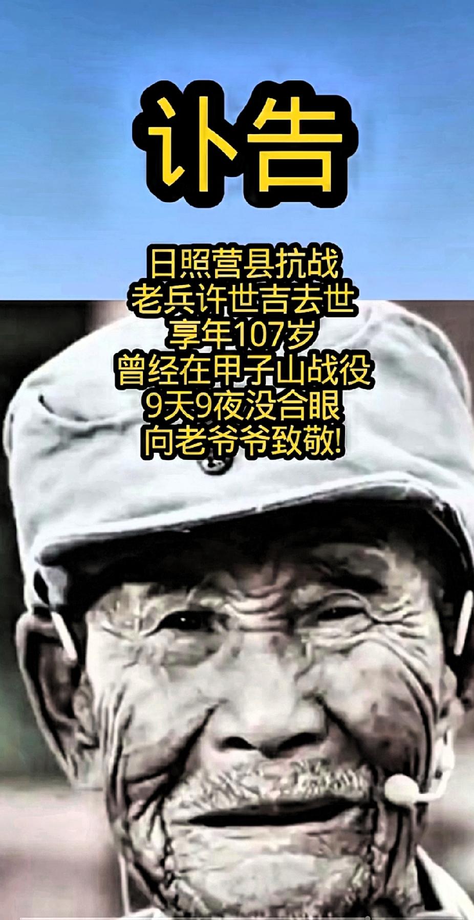 曾经在甲子山战役,9天9夜没合眼的 老兵,许世吉老爷爷去世,享年107岁!许世吉老爷子,你是抗日大英雄,为抗日九天没合眼感动我们,致敬民族英雄,老爷子安息,我们永远怀念你![玫瑰][玫瑰][玫瑰]向抗日老兵致敬[送自己一朵花][送自己一朵花][送自己一朵花]!共和国的英雄[赞][赞][赞]。一路走好[祈祷][祈祷][祈祷]!希望天堂没有战争[比心][比心][比心]!