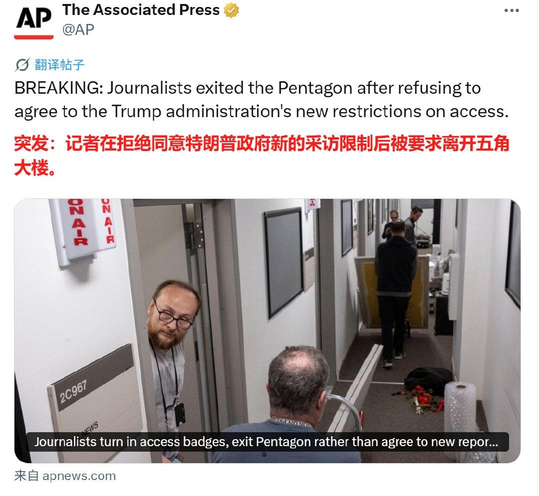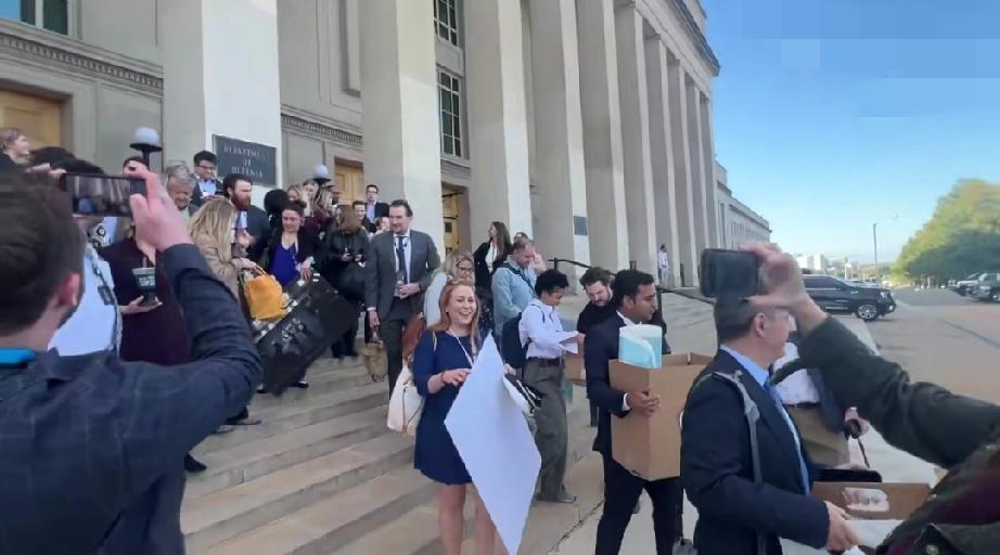 美媒:“今天是美国新闻自由黑暗的一天。” 就在刚才,在五角大楼办公的几乎所有美国主流媒体记者,全部集体清理了他们的办公室,并一起上交了记者证,然后带着自己的东西全部离开五角大楼,以表示“捍卫第一修正案”。 此外,五角大楼新闻协会也发布了一份声明,称15日是美国新闻只有的“黑暗一天”,并表示五角大楼的行为“引发了人们对美国在治理透明度、五角大楼公共问责制和所有人言论自由方面的承诺不断削弱的担忧。” 此前除一家媒体外,所有新闻机构都拒绝在周二签署国防部长皮特·黑格塞斯(Pete Hegseth)提出的一份“承诺书”——同意五角大楼新闻团体施加的新规则和限制。