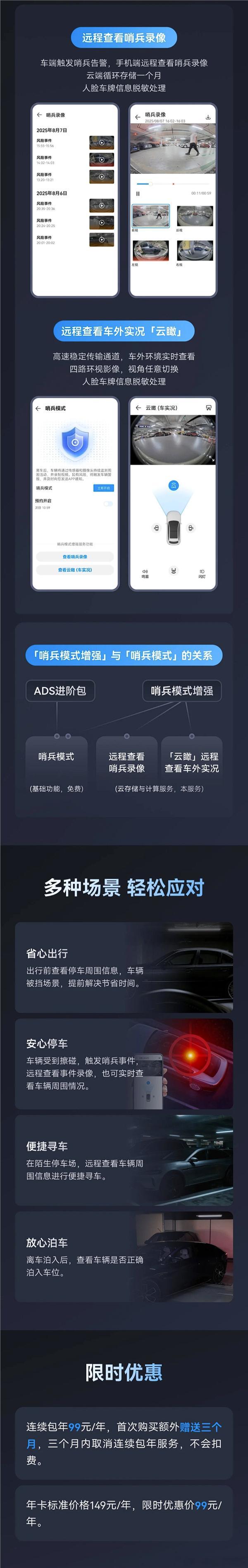 华为宣布旗下ADS乾崑智驾的哨兵模式新增两项实用功能,升级为哨兵模式增强版,并推出优惠价格:年卡149元/年,限时优惠价99元/年,连续包年99元/年(首次购买额外赠送3个月)。该功能已在华为乾崑App上线,由深圳引望智能技术有限公司提供服务。HUAWEI ADS哨兵模式增强包含云存储与计算服务,支持出行前检查停车周围情况、停车预警监测、陌生停车场寻车、离车泊入后检查等功能。