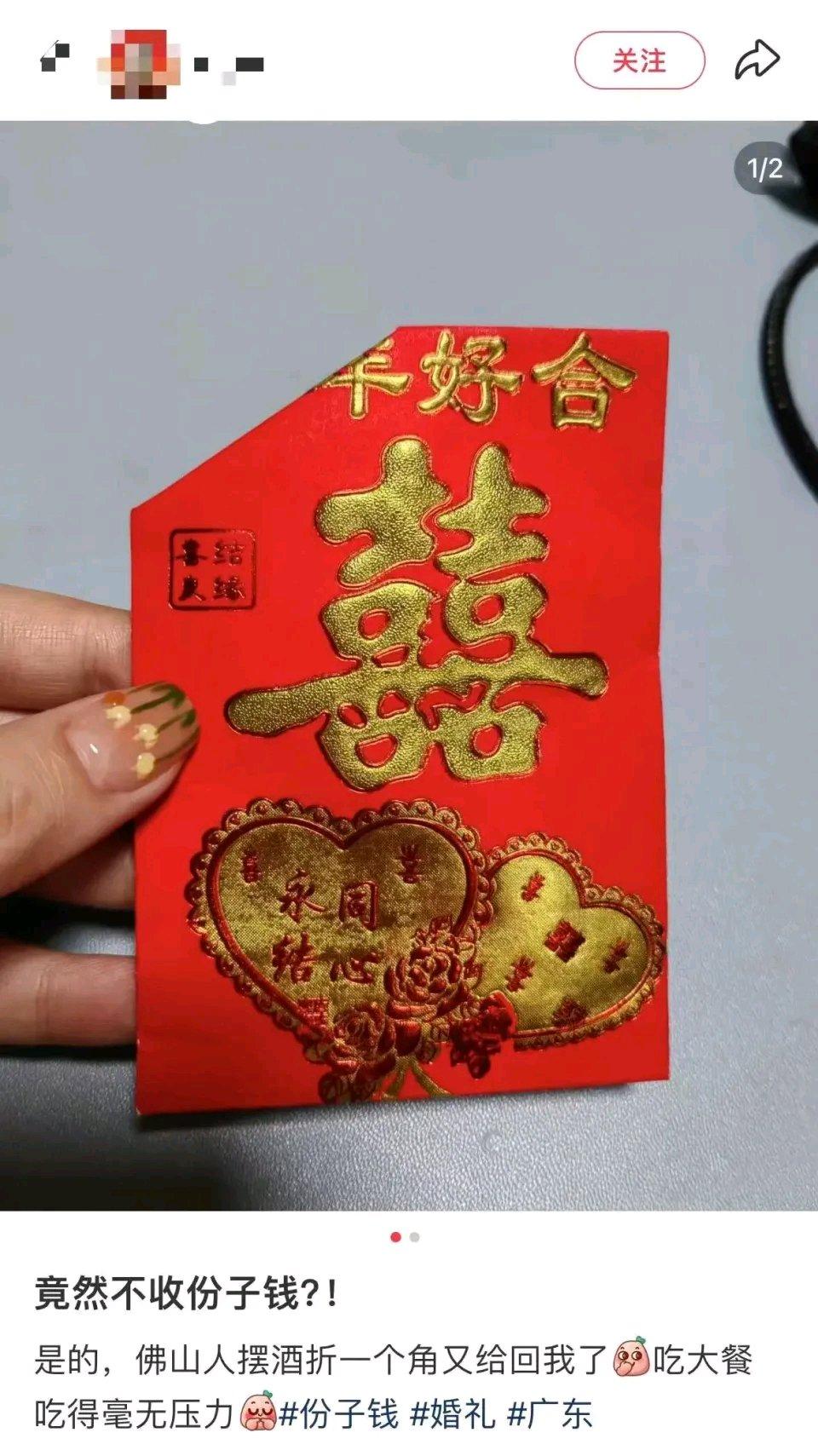最近,一个广东佛山顺德的婚礼火了。北方的宗小姐参加朋友婚礼递红包时,新娘只摸了下、折个角就还回来了。这一风俗让宗小姐震惊,也引发网友共鸣,很多人建议全国推广。 顺德当地人办喜事一般不收红包,大家觉得宾客花时间赴宴就是心意。其实在广东不少地区,喜事随礼、新年派利是都“讲心不讲金”。反观当下,很多地方份子钱居高不下,让宾客经济压力大。像国庆期间,不少人收到一堆婚礼请帖,为份子钱发愁。广东这种“重情轻礼”的风俗,还有极简婚礼的形式,真的值得学习。